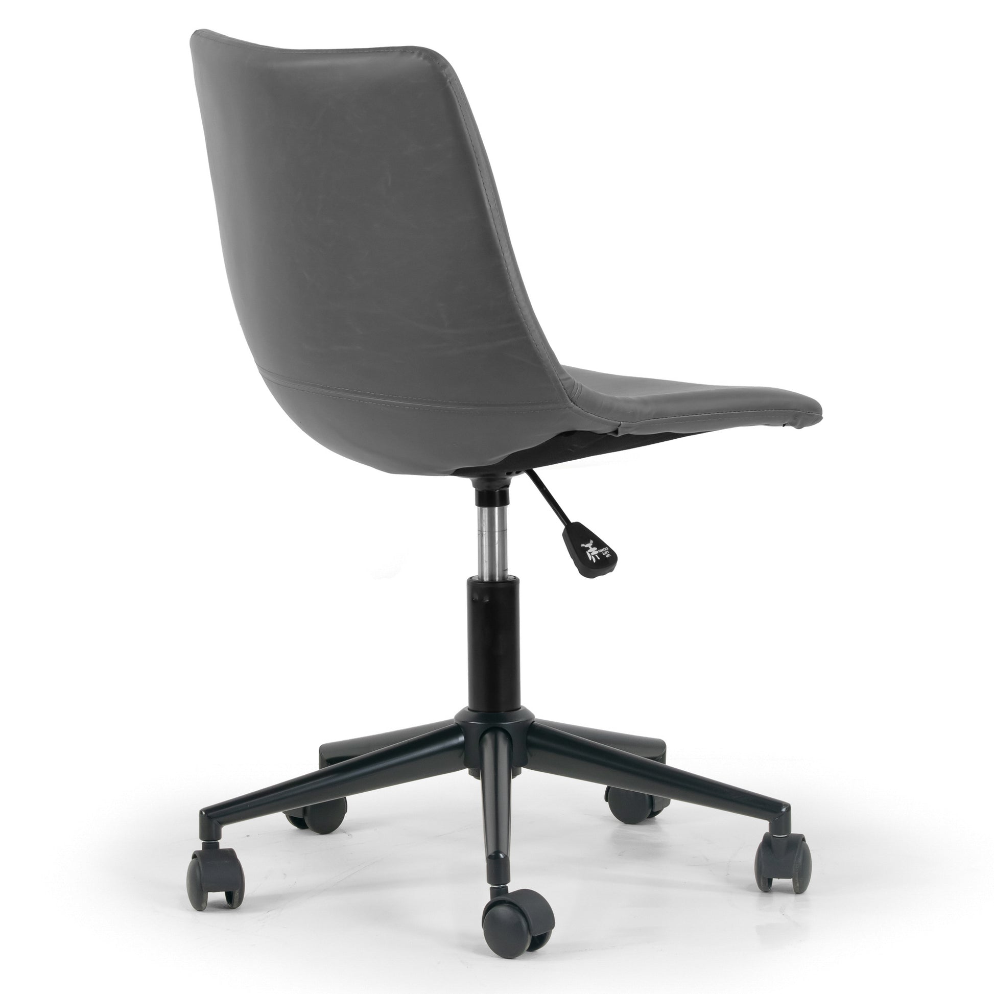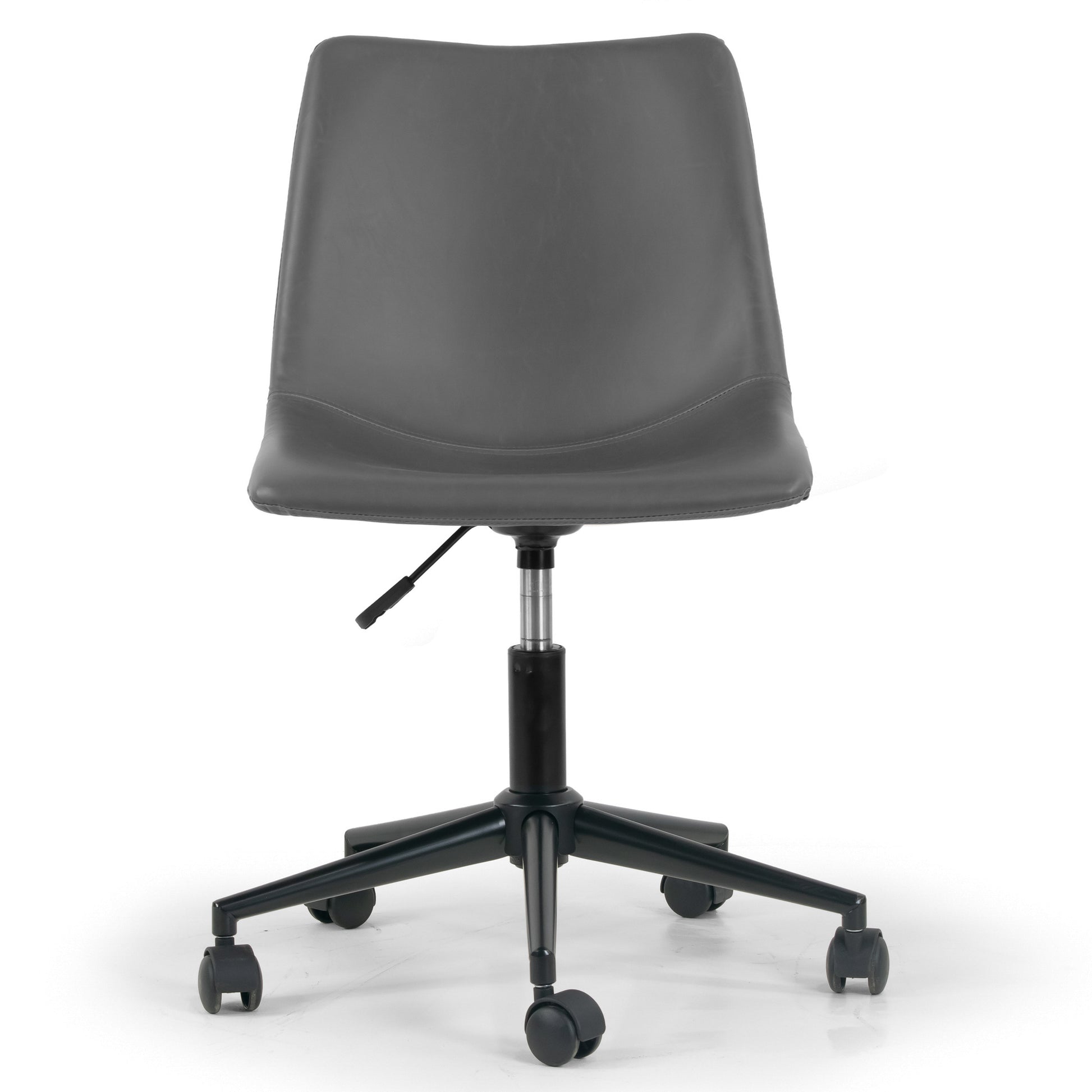 This is a grey faux leather adjustable height office chair with black finish frame and wheel base. With simple and clean armless one-piece seat and back design, this office chair is modern and chic. High quality black finish metal frame with five-wheel base is steady and durable. This office chair is height-adjustable and swivels 360 degrees.