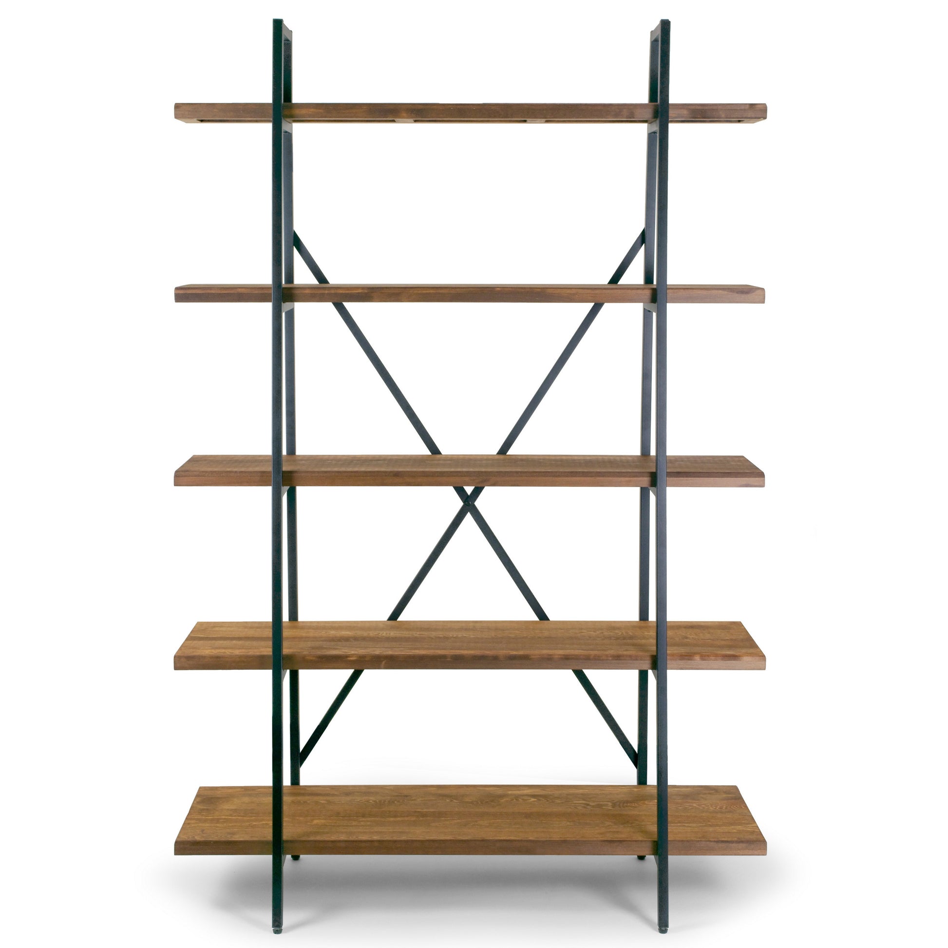 Chic, simple, versatile and durable, this etagere bookcase has it all. Black metal frame and five full shelves made of pine wood create a modern industrial look, provide generous organization space, and add style to your room. Each shelf becomes wider from top to bottom, creating a slightly leaning design. Assembly is needed. Clean with dry cloth recommended.