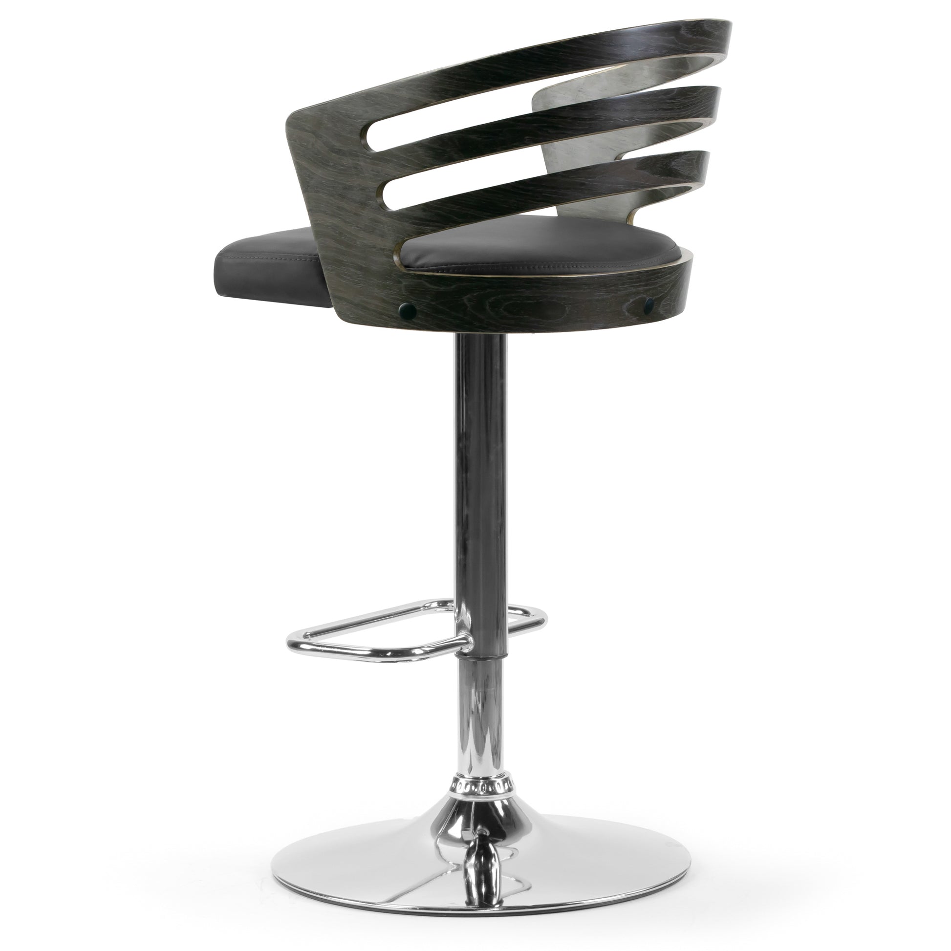 Stylish and modern, this grey bentwood frame height barstool will surely become the center piece of your bar. High quality bentwood frame is made of wood veneer over plywood. Grey faux leather upholstery completes the look. Comfortable cushioning provides comfort even for long time seating. This barstool is height adjustable and it swivels 360 degrees. Assembly needed. Wipe clean with dry cloth.