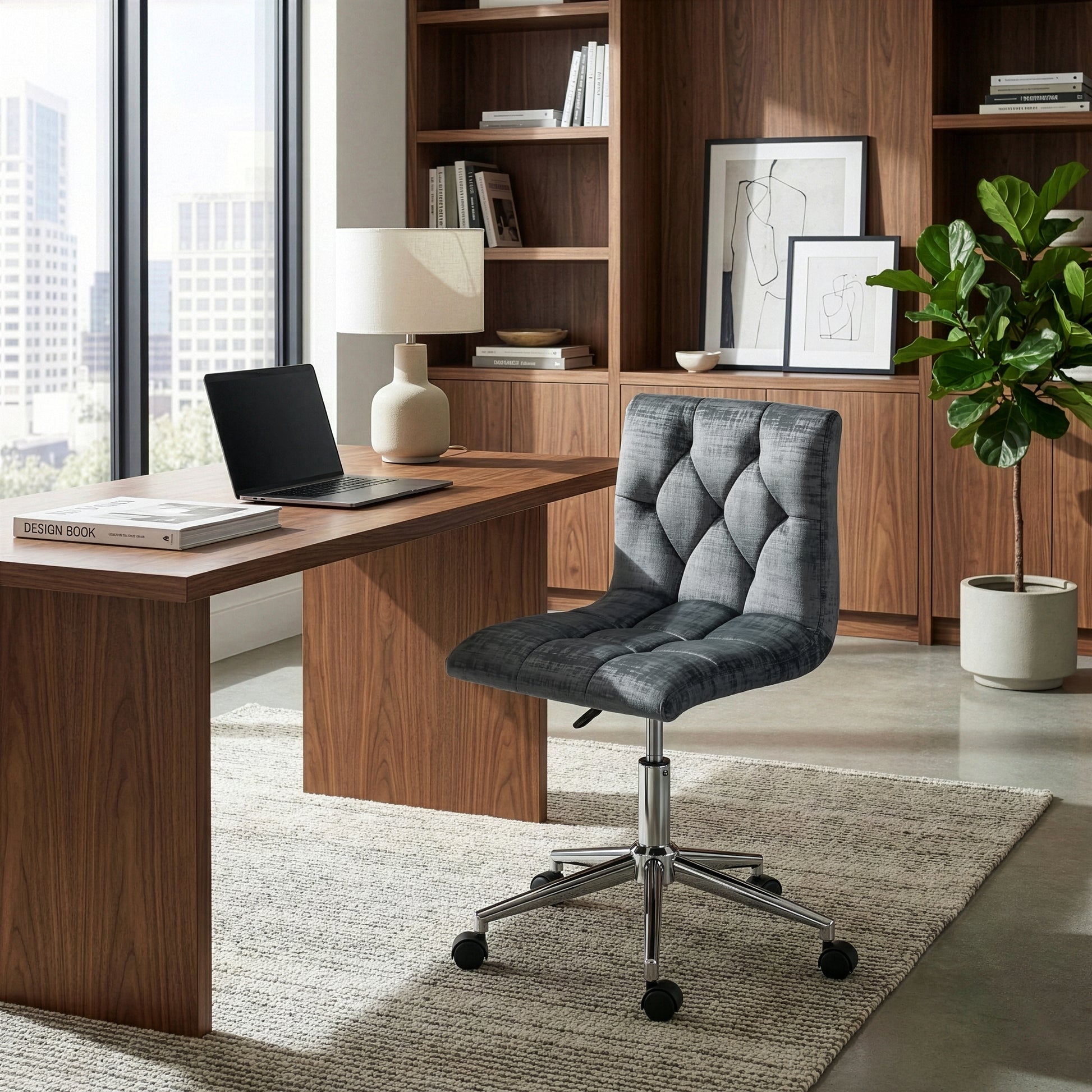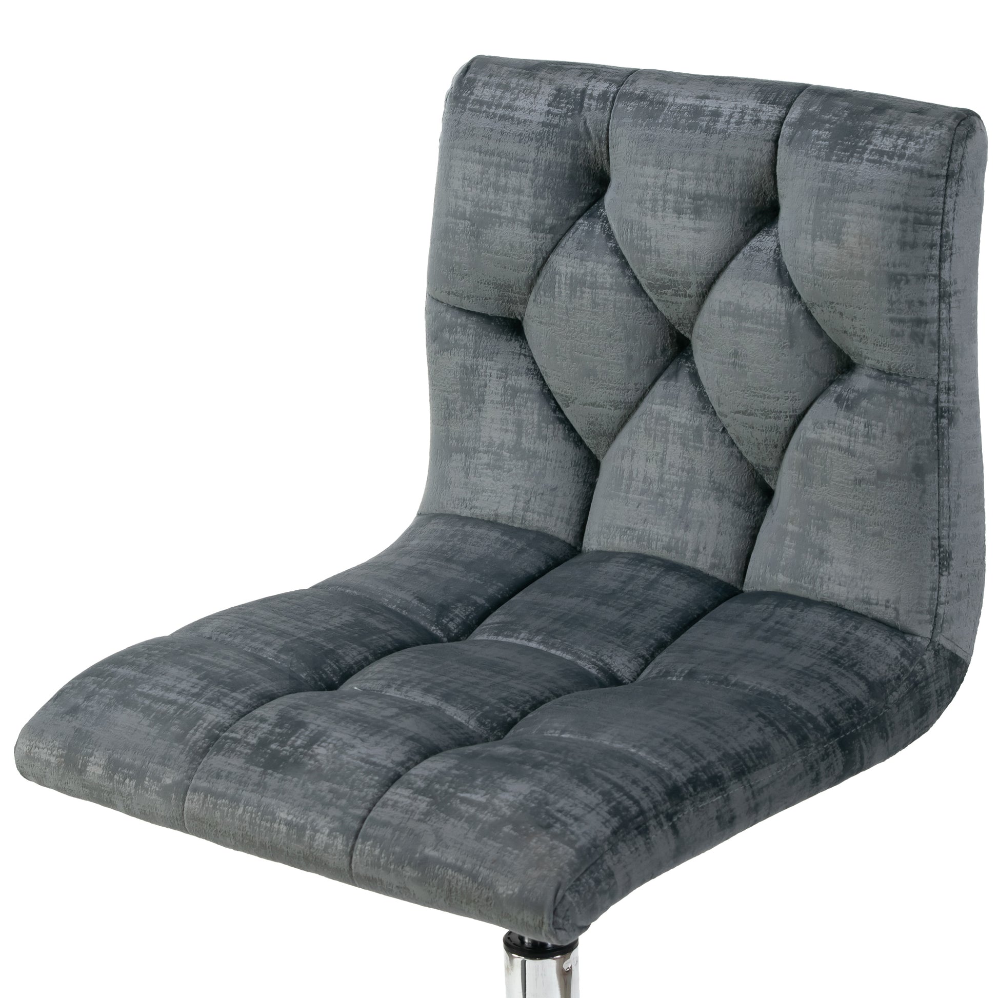 Modern grey velvet upholstered adjustable height swivel armless office chair with decorative stitching and chrome wheel base. Simple modern design with delicate decorative stitching details, this office chair is classic yet unique. Generously thick cushions with velvety grey fabric upholstery offer comfort even for long time seating. High quality chrome finish metal frame with wheel base is steady and durable. This office is height-adjustable and swivels 360 degrees. Minor assembly needed. Spot clean recommended.