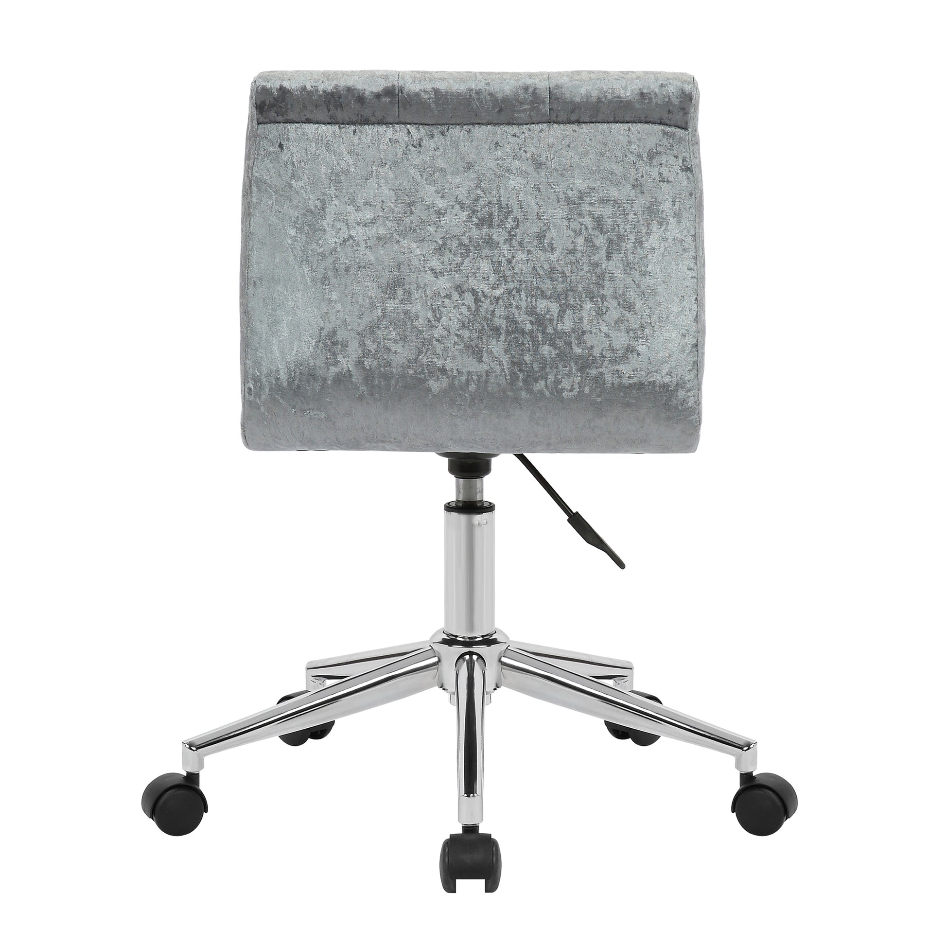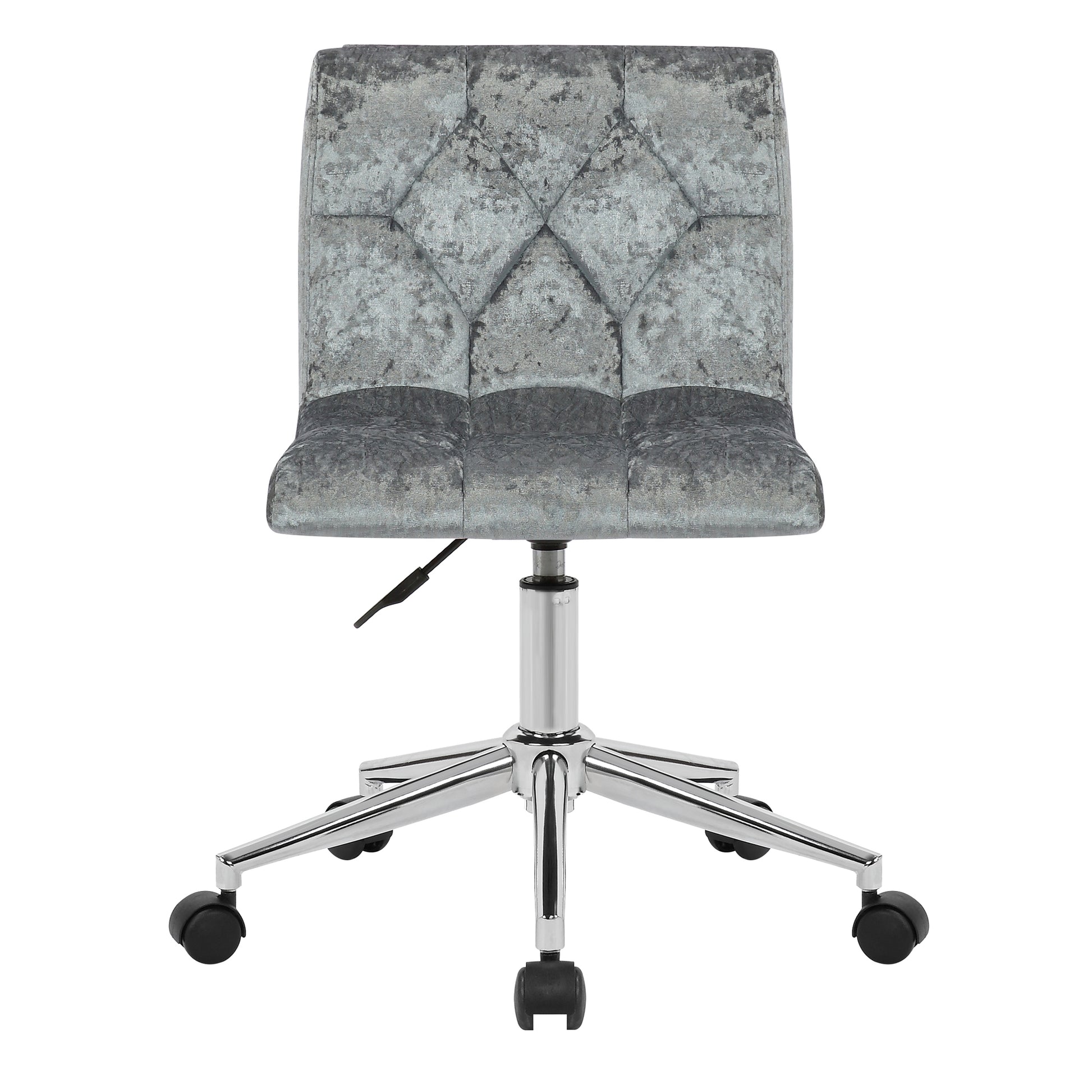 Modern silver velvet upholstered adjustable height swivel armless office chair with decorative stitching and chrome wheel base. Simple modern design with delicate decorative stitching details, this office chair is classic yet unique. Generously thick cushions with velvety grey fabric upholstery offer comfort even for long time seating. High quality chrome finish metal frame with wheel base is steady and durable. This office is height-adjustable and swivels 360 degrees. Minor assembly needed. Spot clean recommended.