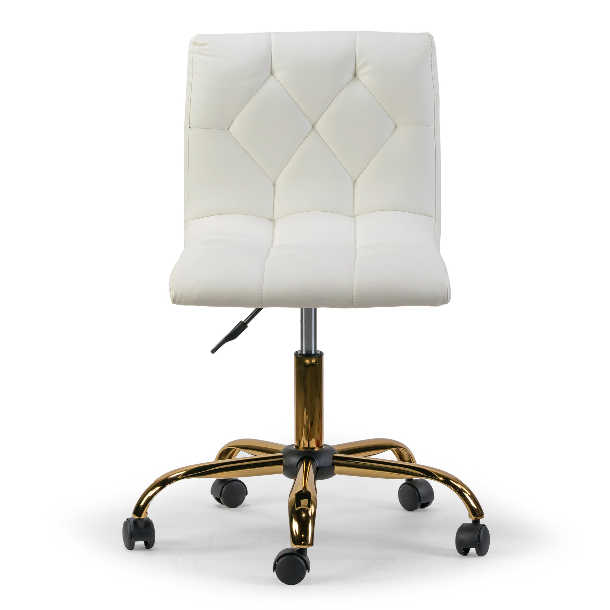 Modern cream finish upholstered adjustable height swivel armless office chair with decorative stitching and golden finish wheel base. This office chair offers simple modern design with retro-modern glamorous color scheme as well as delicate decorative stitching details. Generously thick cushions with cream finish upholstery provide comfort even for long time seating. High quality chrome finish metal frame with wheel base is steady and durable. This office is height-adjustable and swivels 360 degrees. Minor assembly needed. Wipe clean with dry cloth.