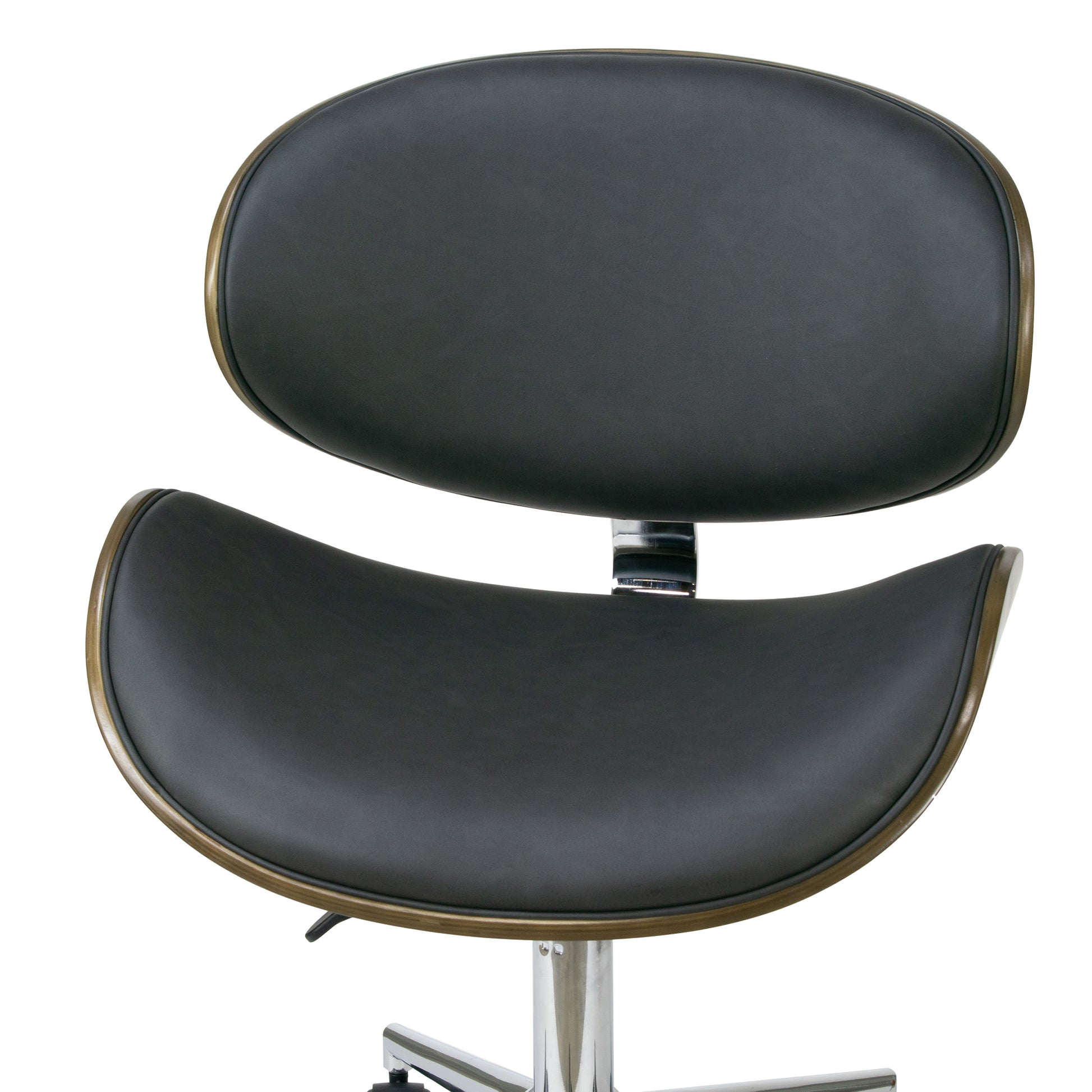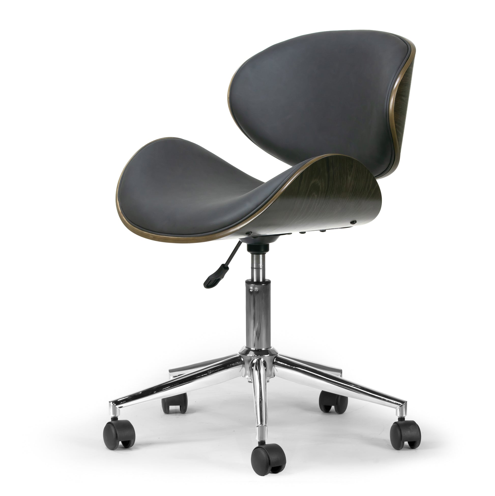 Modern dark grey upholstered adjustable height swivel office chair with dark grey plywood bentwood back and seat frame. Generously thick cushions provide comfort even for long time seating. High quality chrome finish metal frame with wheel base is steady and durable. This office is height-adjustable and swivels 360 degrees. Minor assembly needed. Wipe clean with dry cloth.