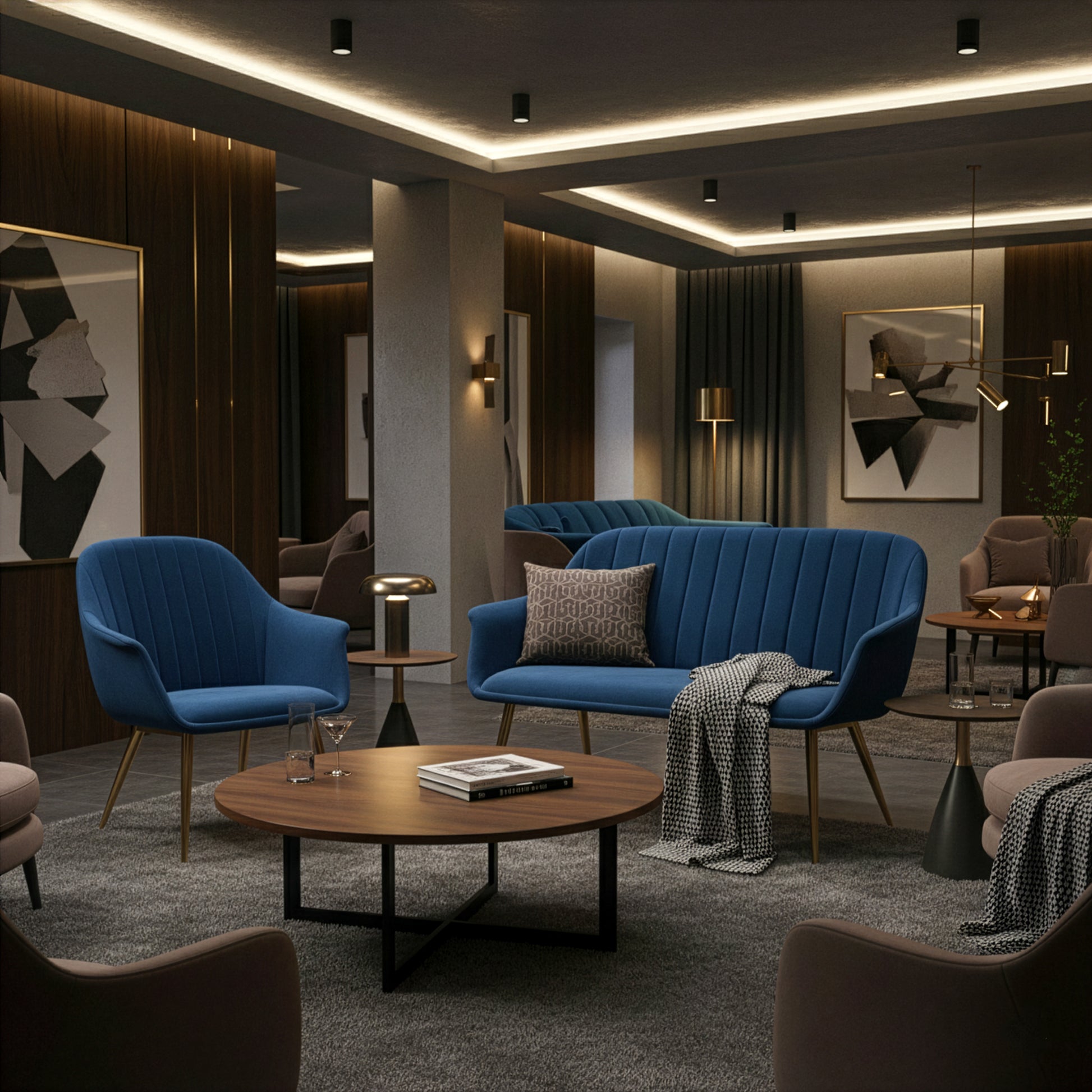 This blue fabric loveseat and chair set will surely update your living room with style. Upholstered with blue velvety fabric, this 2 seater is a statement of being bold, modern and chic. Decorative stitching and pillows add delicate details. Gold-tone finished metal frames are solid and sturdy. Screw-in floor protectors are used for the legs, which not only protectors your floor but also add minor height flexibility.