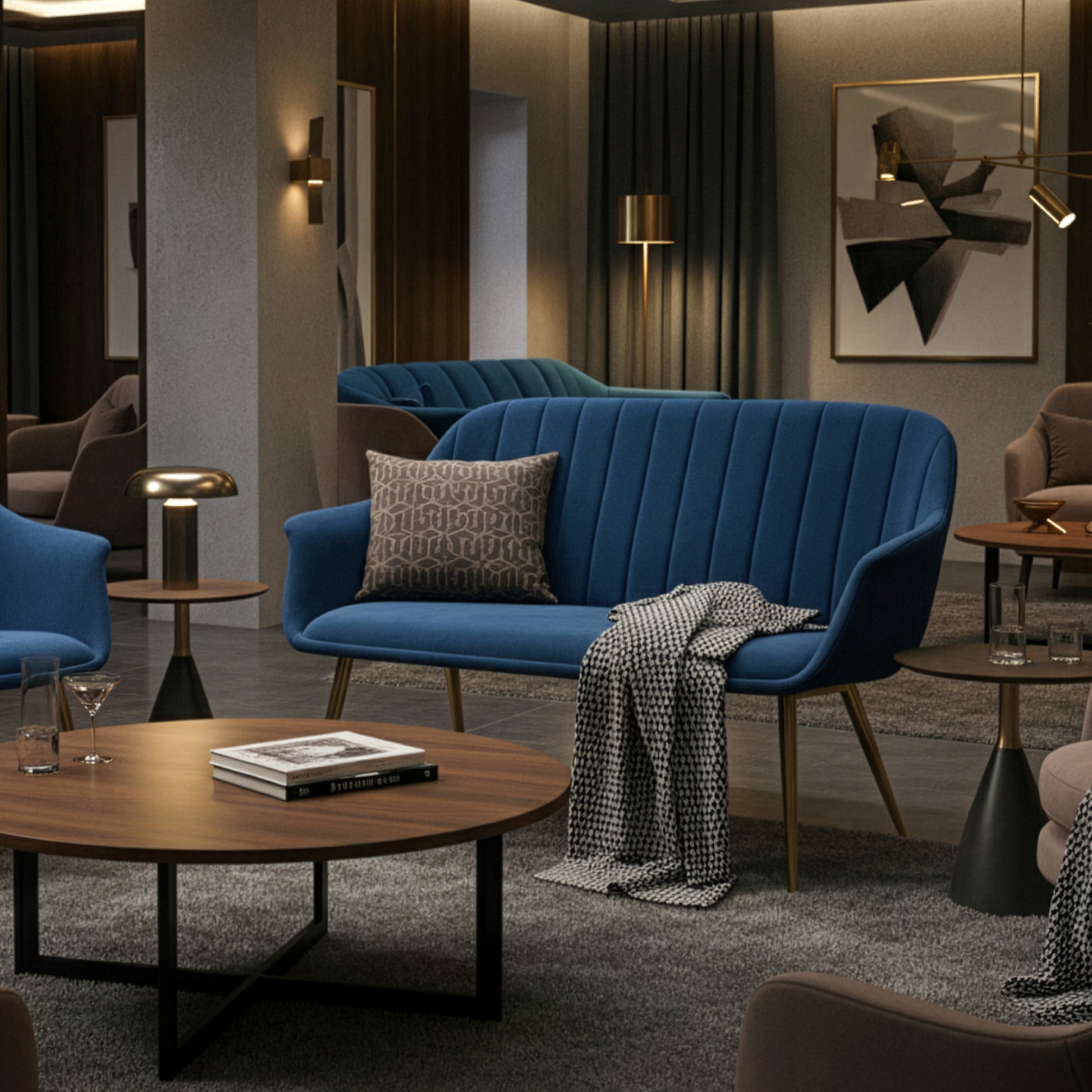 This blue fabric loveseat sofa will surely update your living room with style. Upholstered with blue velvety fabric, this 2 seater is a statement of being bold, modern and chic. Decorative stitching and pillows add delicate details. Gold-tone finished metal frames are solid and sturdy. Screw-in floor protectors are used for the legs, which not only protectors your floor but also add minor height flexibility. Assembly is needed. Spot clean recommended.