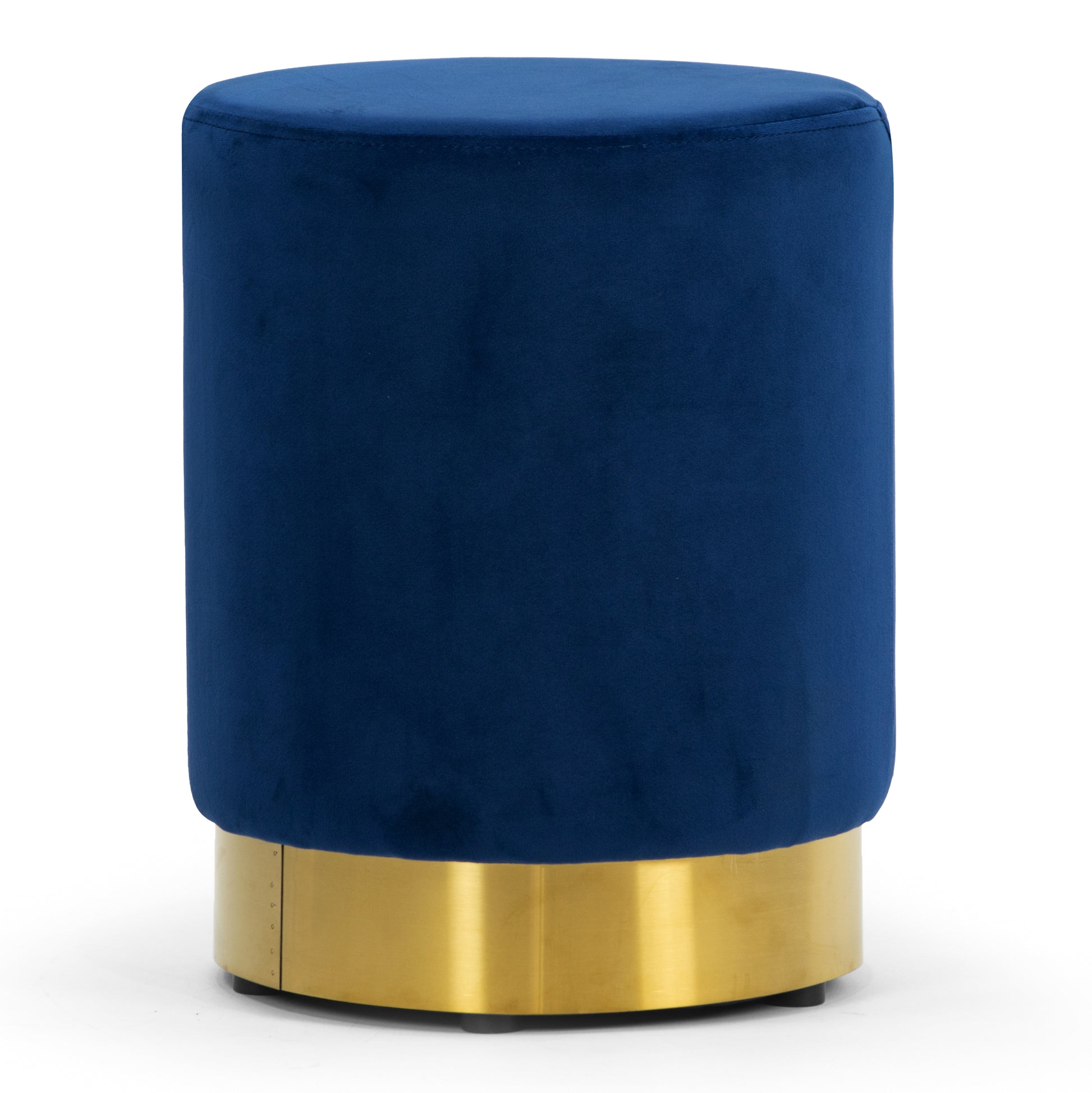 This round ottoman set can be a versatile addition to your room. The set includes three ottomans of different sizes. Each can be used as a footstool or a petite sitting option. Blue velvet upholstery is classy while the golden metal accent wrap around the lower part the ottoman adds the delicacy of modern details. The round shape is kid-friendly as well as space-saving. This item comes fully assembled. Spot clean recommended.