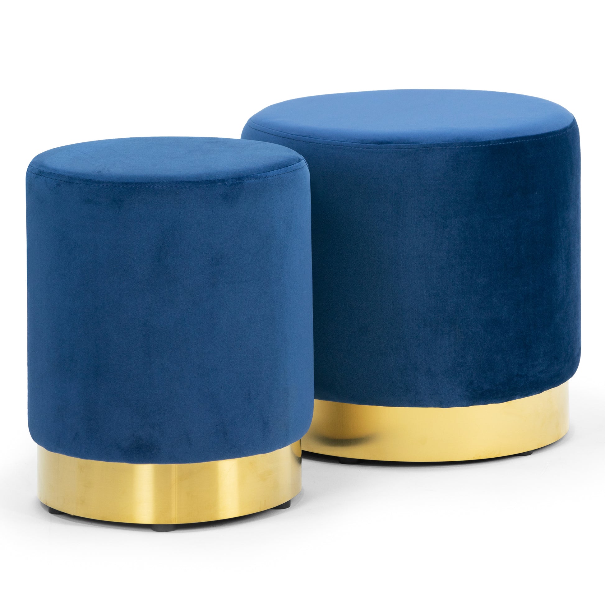 This round ottoman set can be a versatile addition to your room. The set includes two ottomans of different sizes. Each ottoman can be used as a footstool or a petite sitting option. Blue velvet upholstery is classy while the golden metal accent wrap around the lower part the ottoman adds the delicacy of modern details. The round shape is kid-friendly as well as space-saving.