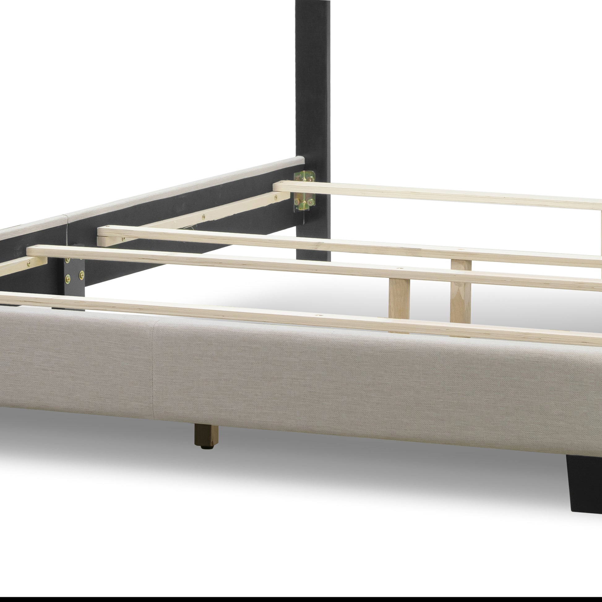 A classic design with updated modern details. Neutral color scheme will beautifully match other pieces in your bedroom. Rubber wood frame offers quality for use, while button tufting and black nail head trimming add characteristics. This bed ships fast and all parts come in one box. You will need a box spring for better support of your mattress. Assembly required. Spot clean recommended.