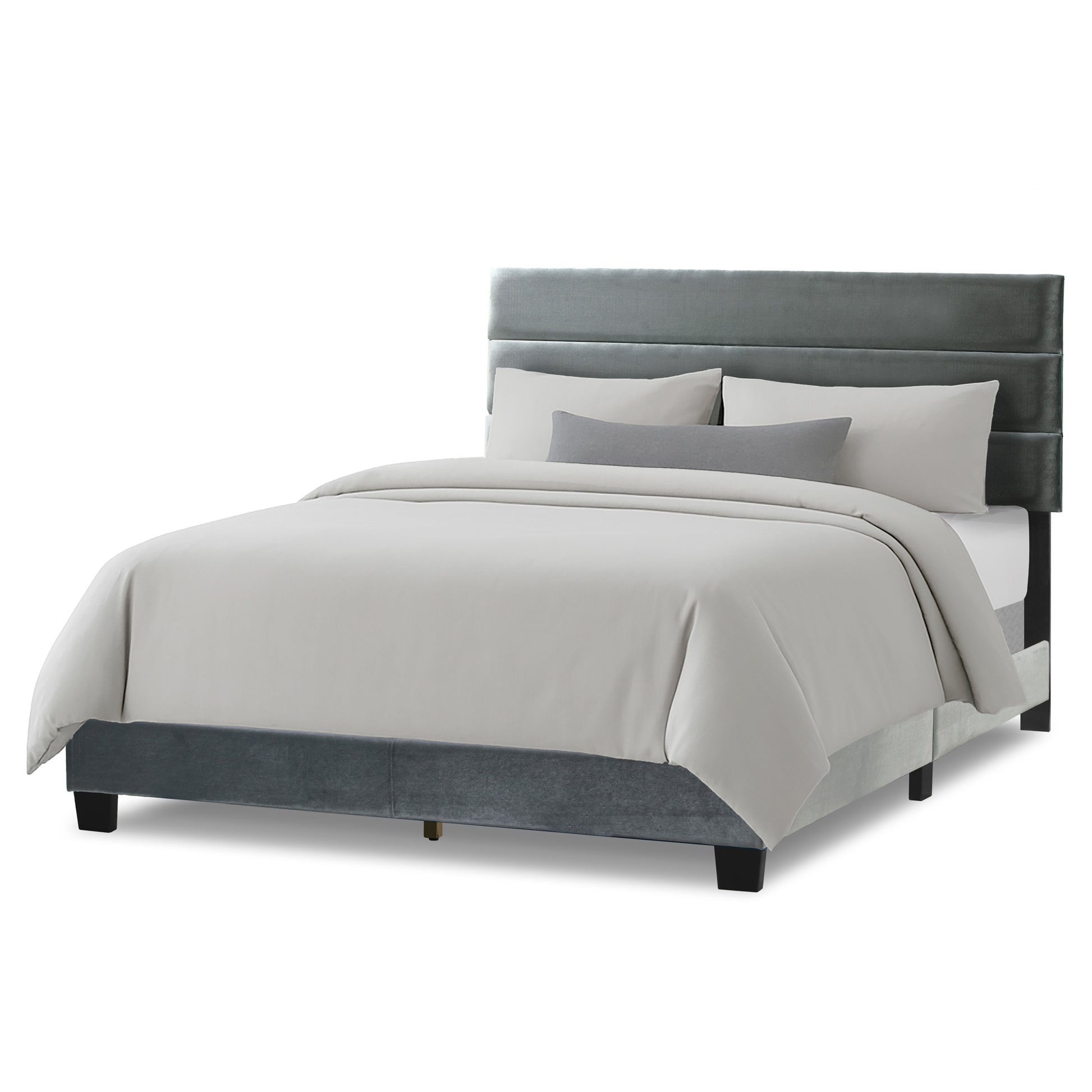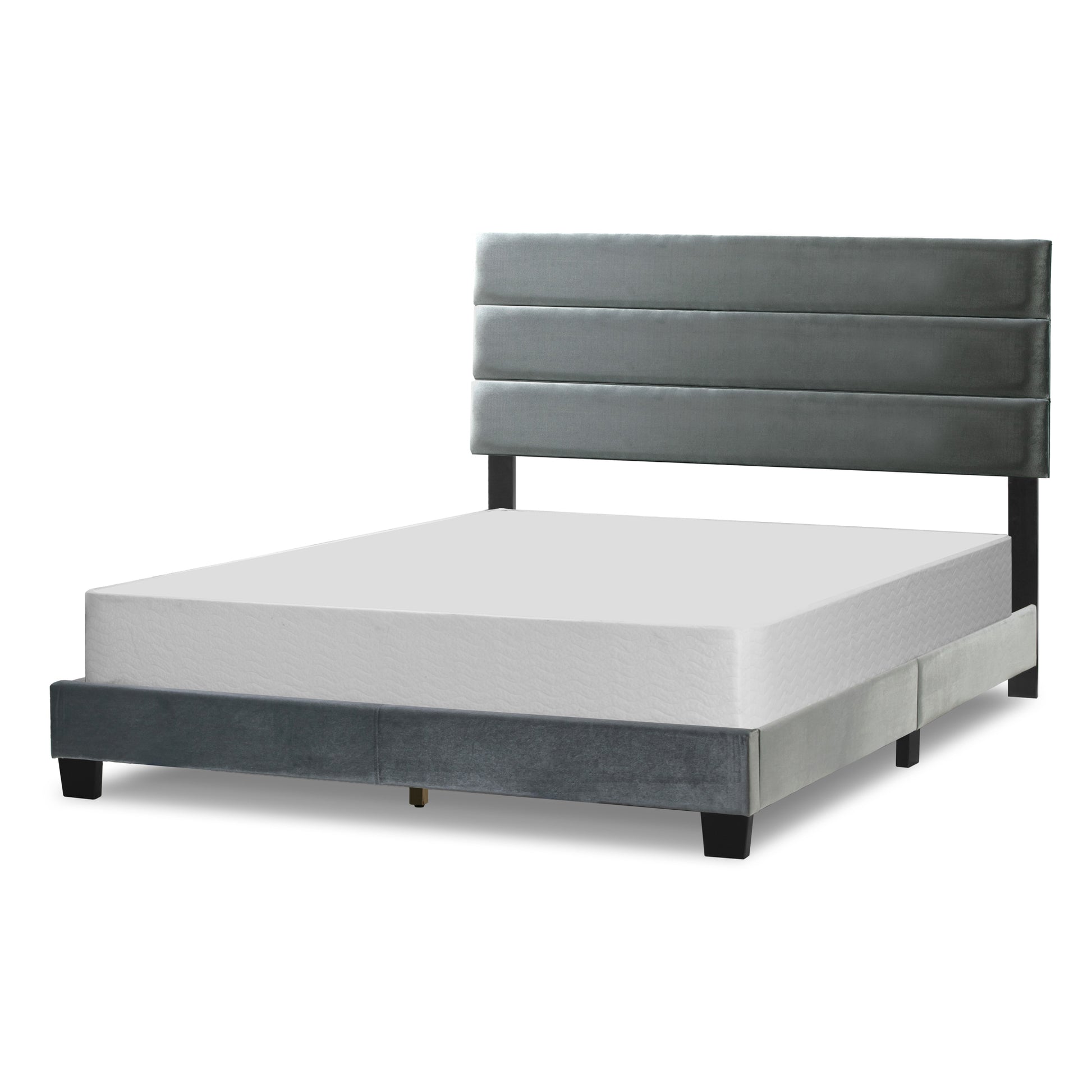 A simple yet classic design with updated details. This bed is minimalist and chic. Unique silver gray velvet upholstery will surely make this bed the center piece of your bedroom. Rubber wood frame offers quality for use, while line stitching tufting adds characteristics. This bed ships fast and all parts come in one box. You will need a box spring for better support of your mattress. Assembly required. Spot clean recommended.