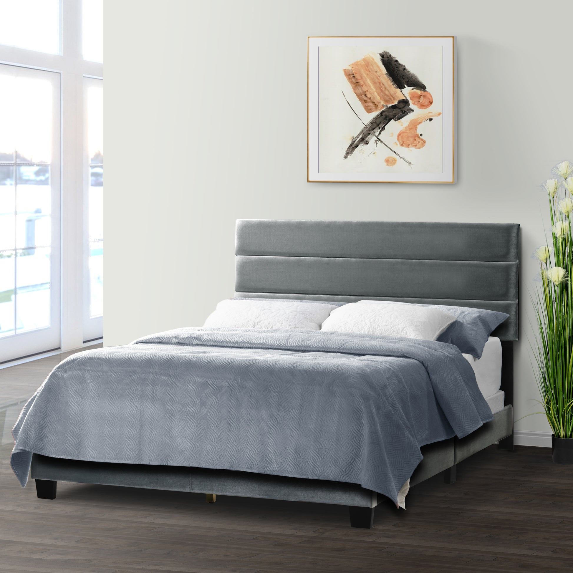 A simple yet classic design with updated details. This bed is minimalist and chic. Unique silver gray velvet upholstery will surely make this bed the center piece of your bedroom. Rubber wood frame offers quality for use, while line stitching tufting adds characteristics. This bed ships fast and all parts come in one box. You will need a box spring for better support of your mattress. Assembly required. Spot clean recommended.