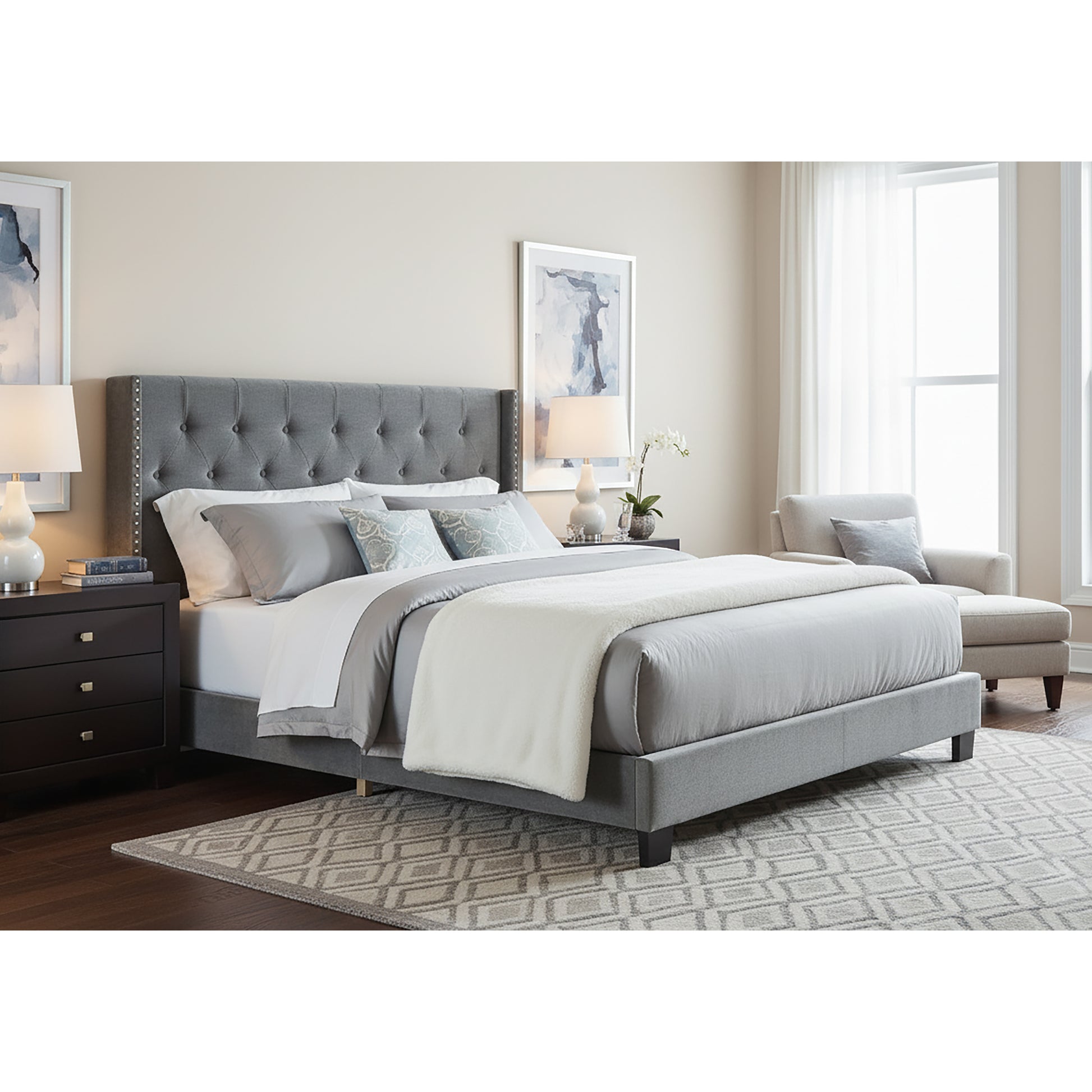A classic design with updated modern details. Unique silver gray velvet upholstery will surely make this bed the center piece of your bedroom. Rubber wood frame offers quality for use, while button tufting and nail head decorated wings adds characteristics. This bed ships fast and all parts come in one box. You will need a box spring for better support of your mattress. Assembly required. Spot clean recommended.