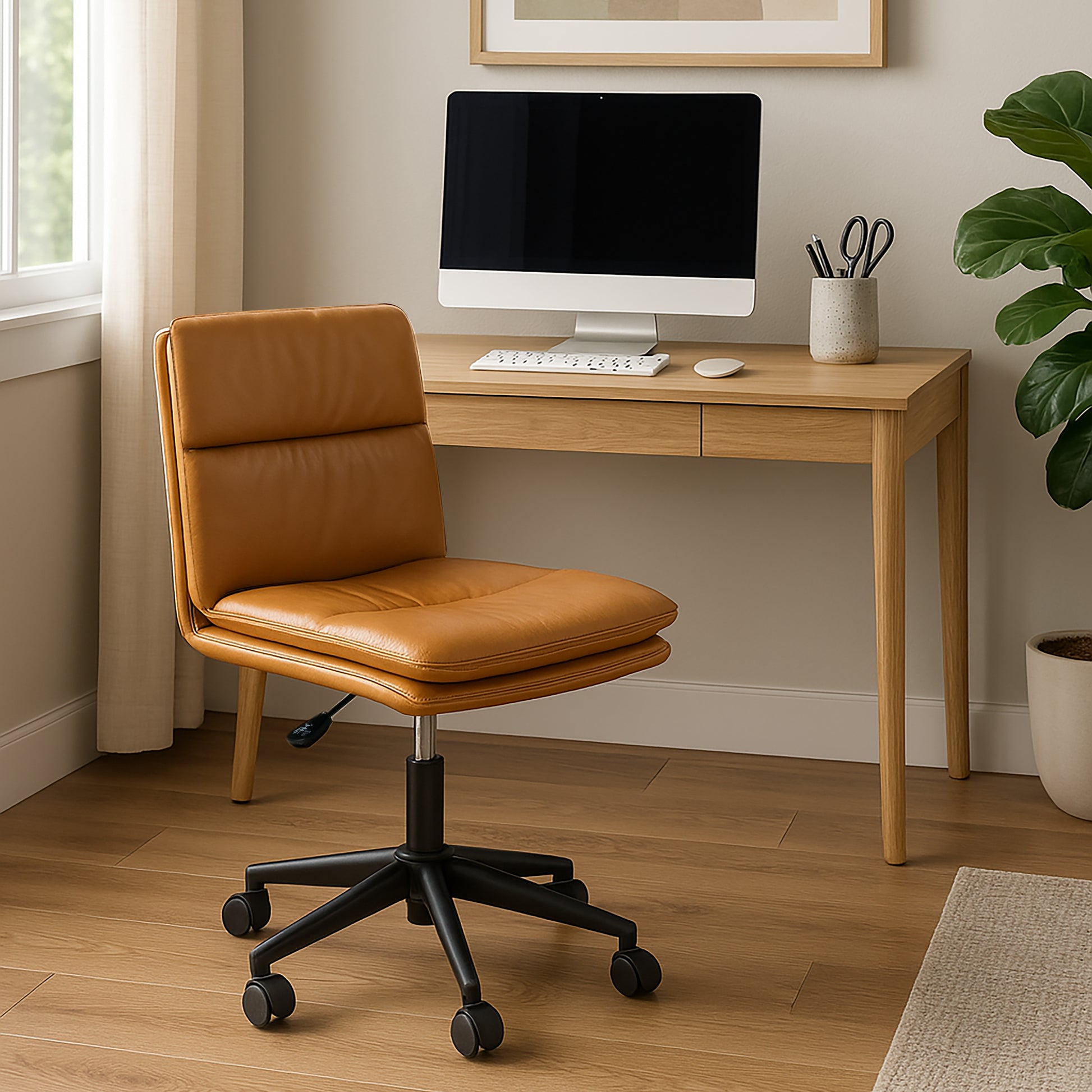 This is a cappuccino brown faux leather adjustable height office chair with metal frame and wheelbase. With simple armless one-piece seat and back design, this office chair is modern and chic. Pillow-shaped seat and back cushions offer extra seating comfort. High quality black finish metal frame with five-wheel base is steady and durable. This office chair is height-adjustable and swivels 360 degrees.