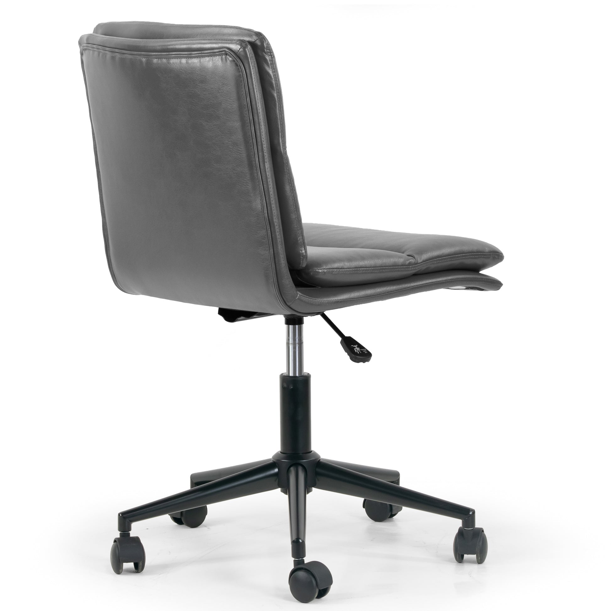This is a grey faux leather adjustable height office chair with metal frame and wheelbase. With simple armless one-piece seat and back design, this office chair is modern and chic. Pillow-shaped seat and back cushions offer extra seating comfort. High quality black finish metal frame with five-wheel base is steady and durable. This office chair is height-adjustable and swivels 360 degrees.