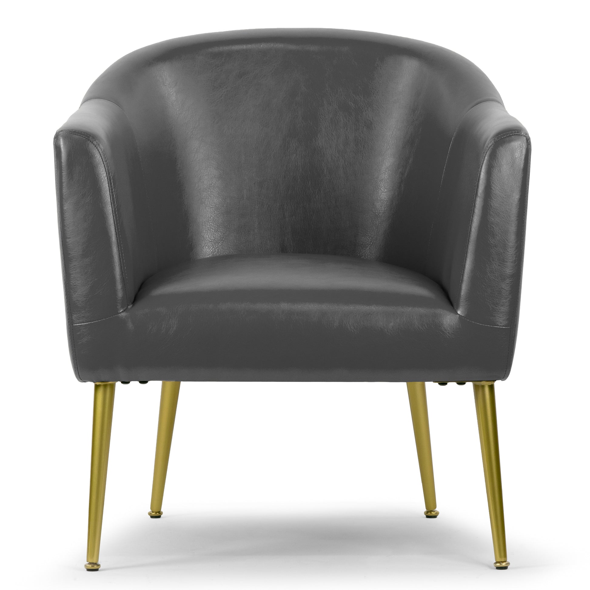 Simple armchair with a modern twist. This classic accent chair is modernized with vivid colored upholstery and metal legs. Gray colored faux leather upholstery compliments the golden finish legs, while the generous foam cushion of the seat and back adds seating comfort.