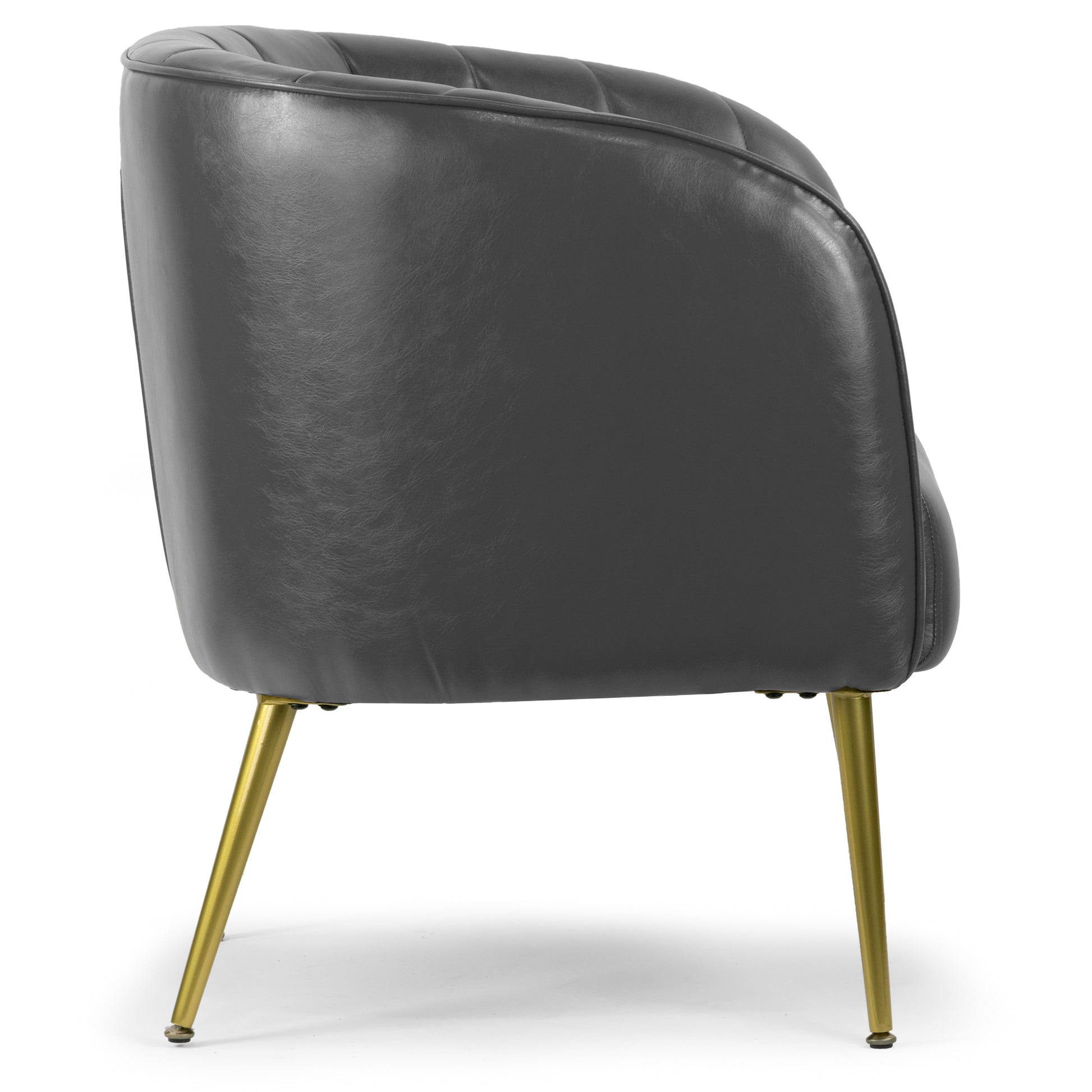Simple armchair with a modern twist. This classic accent chair is modernized with vivid colored upholstery and metal legs. Gray faux leather upholstery compliments the golden finish legs, while the decorative cross stitching on the seat back and piping that goes around the entire chair complete the look. Generous foam cushion of the seat and back adds seating comfort.