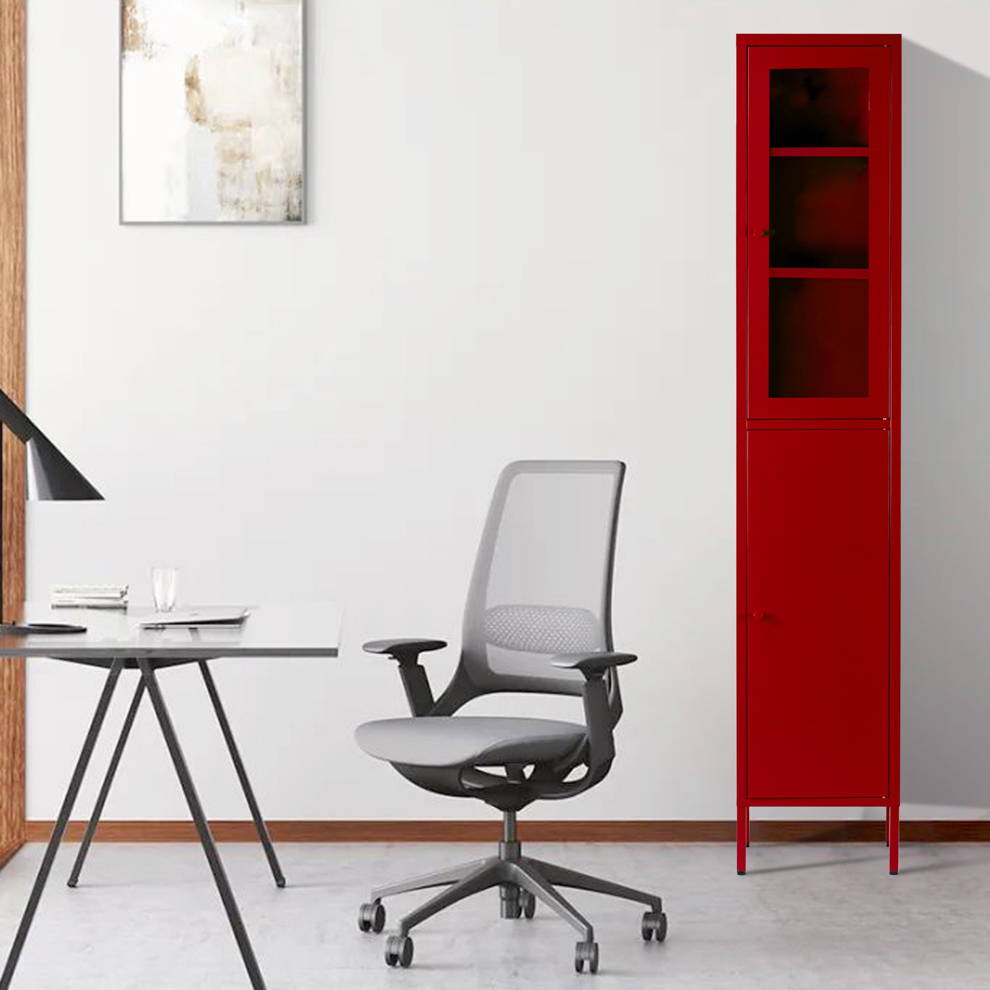 This storage cabinet features a sturdy frame made from steel, ensuring the cabinet is durable and can hold up well over time. The cabinet comes with shelves that can be removed and rearranged to suit your specific storage needs and preferences. This cabinets cabinet has two doors to protect your books and items from dust and other elements. The upper door is made of acrylic glass, which is durable and shatter-free.