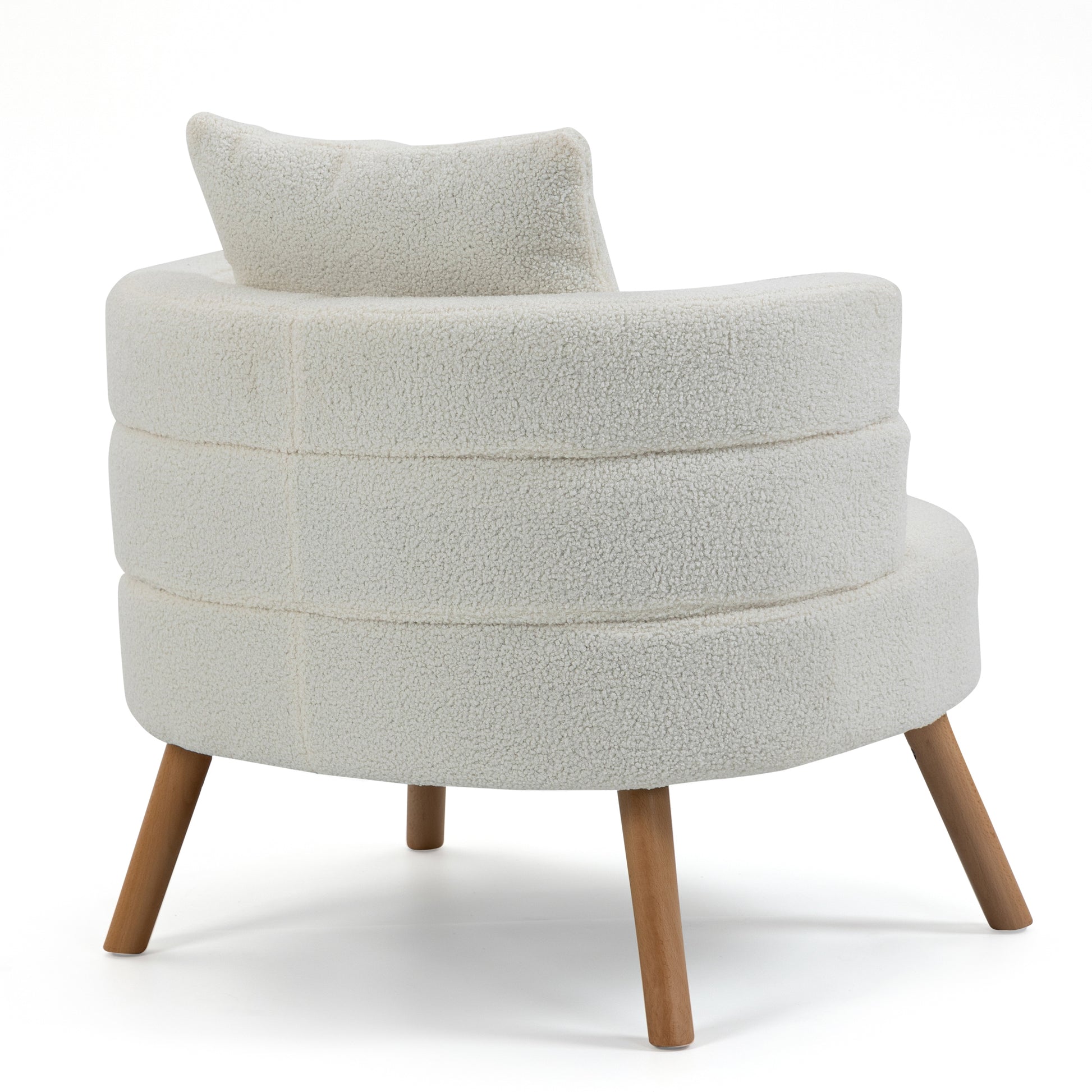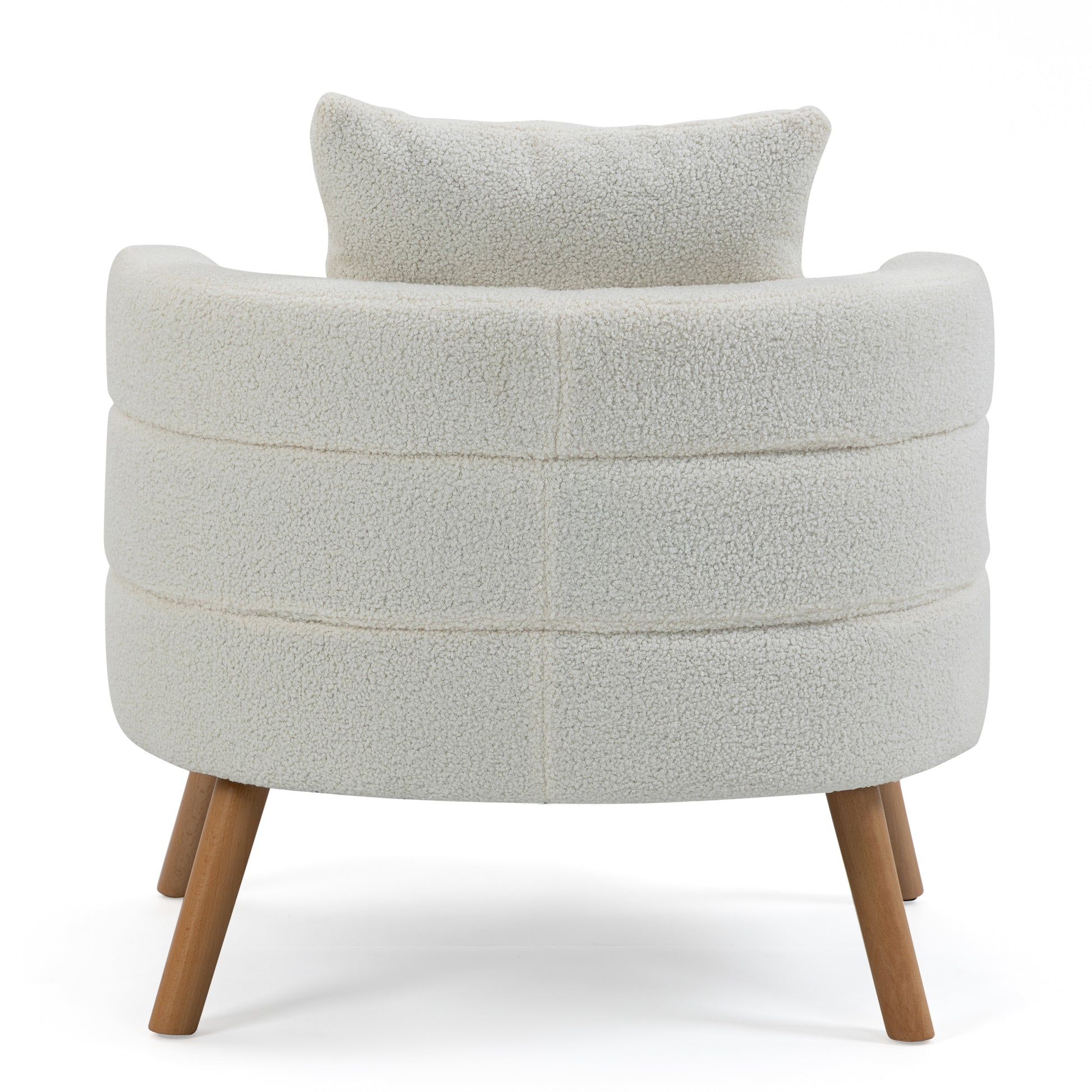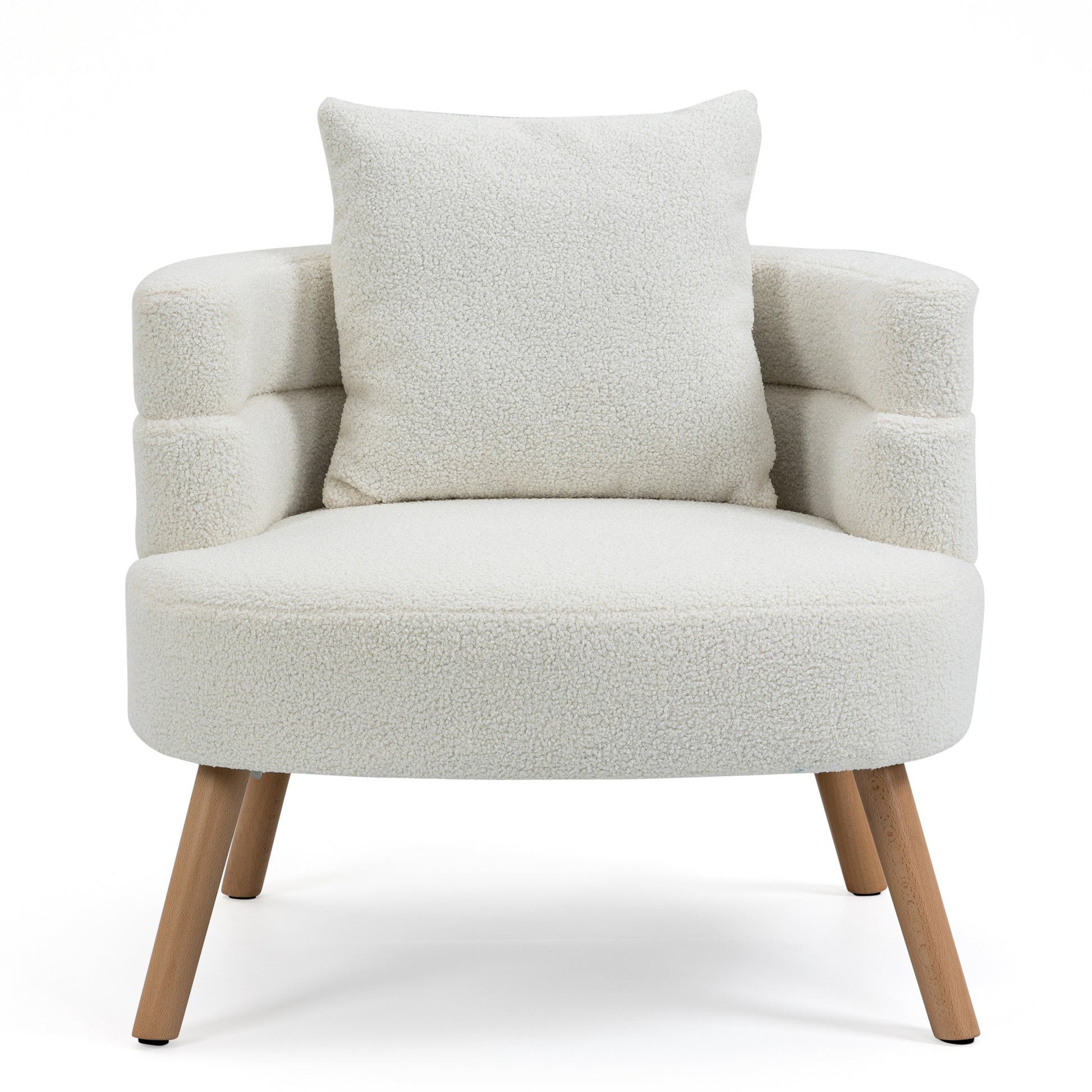 Elevate your interior decor with our exquisite white bouclé accent chair. Crafted with the utmost attention to detail, this chair features elegant wooden legs that infuse warmth and charm into any space. The included pillow enhances your comfort, while the plush bouclé upholstery provides a soft, luxurious feel. This chair is the perfect blend of style and relaxation, making it a must-have addition to your home.
