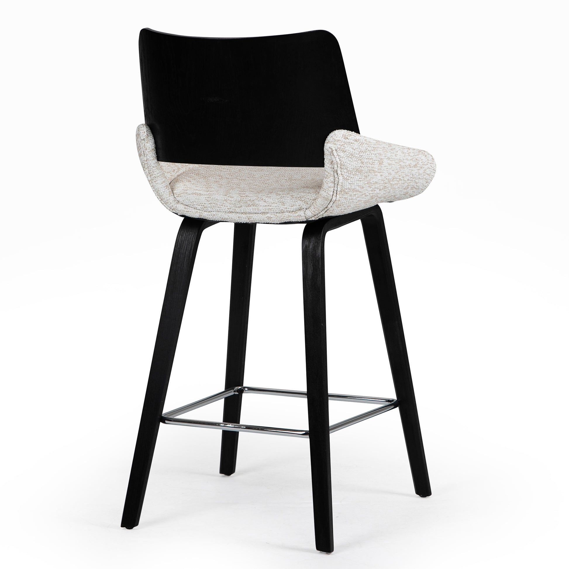 Elevate your space with our chic white two-toned linen fabric counter stool. Its sleek design boasts contrasting black wooden legs and backrest, providing both style and stability. Enjoy comfort with a plush seat and a convenient silver footrest for added support. Perfect for any modern kitchen or bar, this stool effortlessly combines sophistication with functionality.