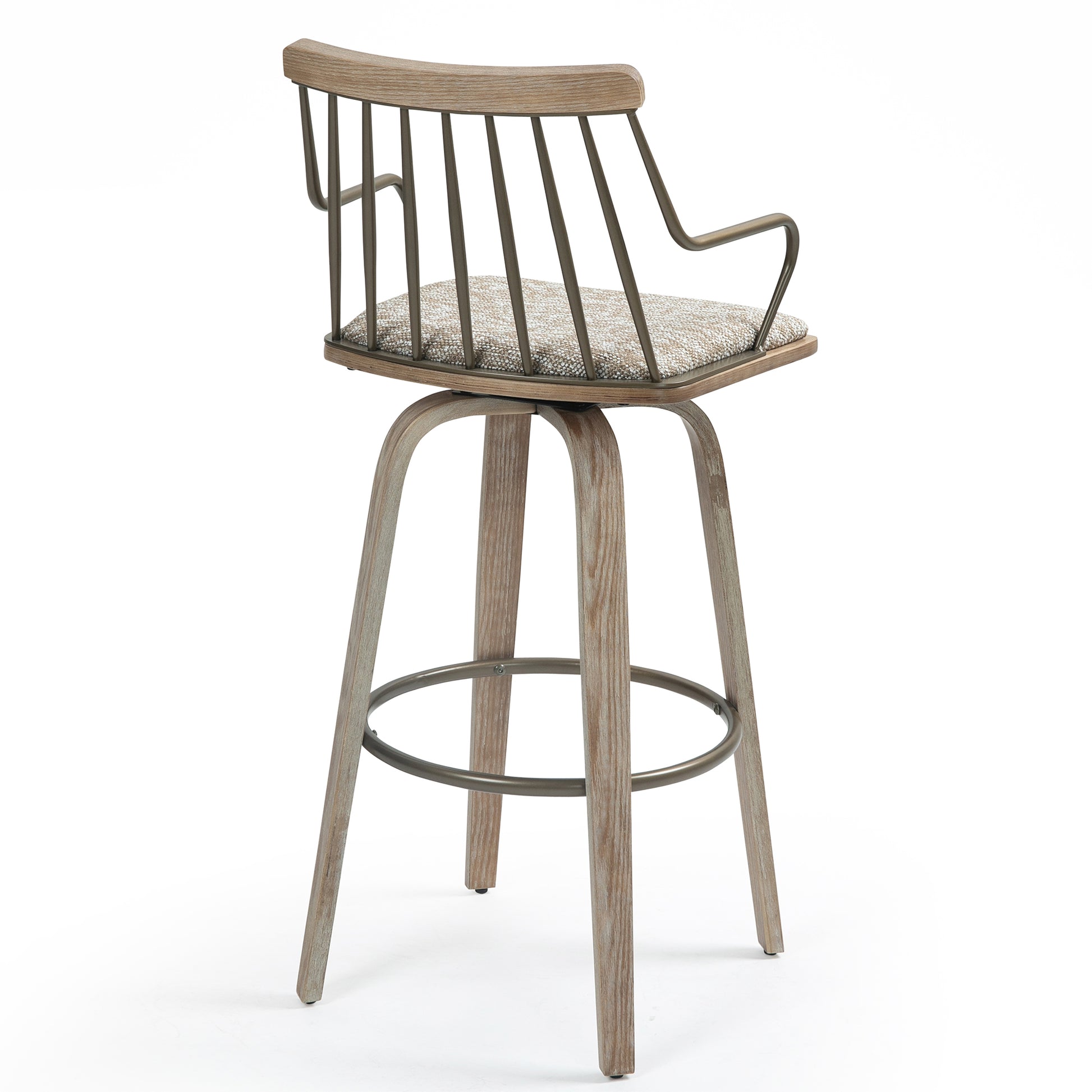 Enhance your kitchen or bar area with our stylish two-toned bar stool. Featuring a unique white and light brown woven fabric design, it boasts a slatted back for added comfort and style. Iron arms provide sturdy support, while a 360-degree rotation allows for easy movement. Complete with an iron footrest for additional comfort, this stool seamlessly combines functionality with elegance for a modern dining experience.