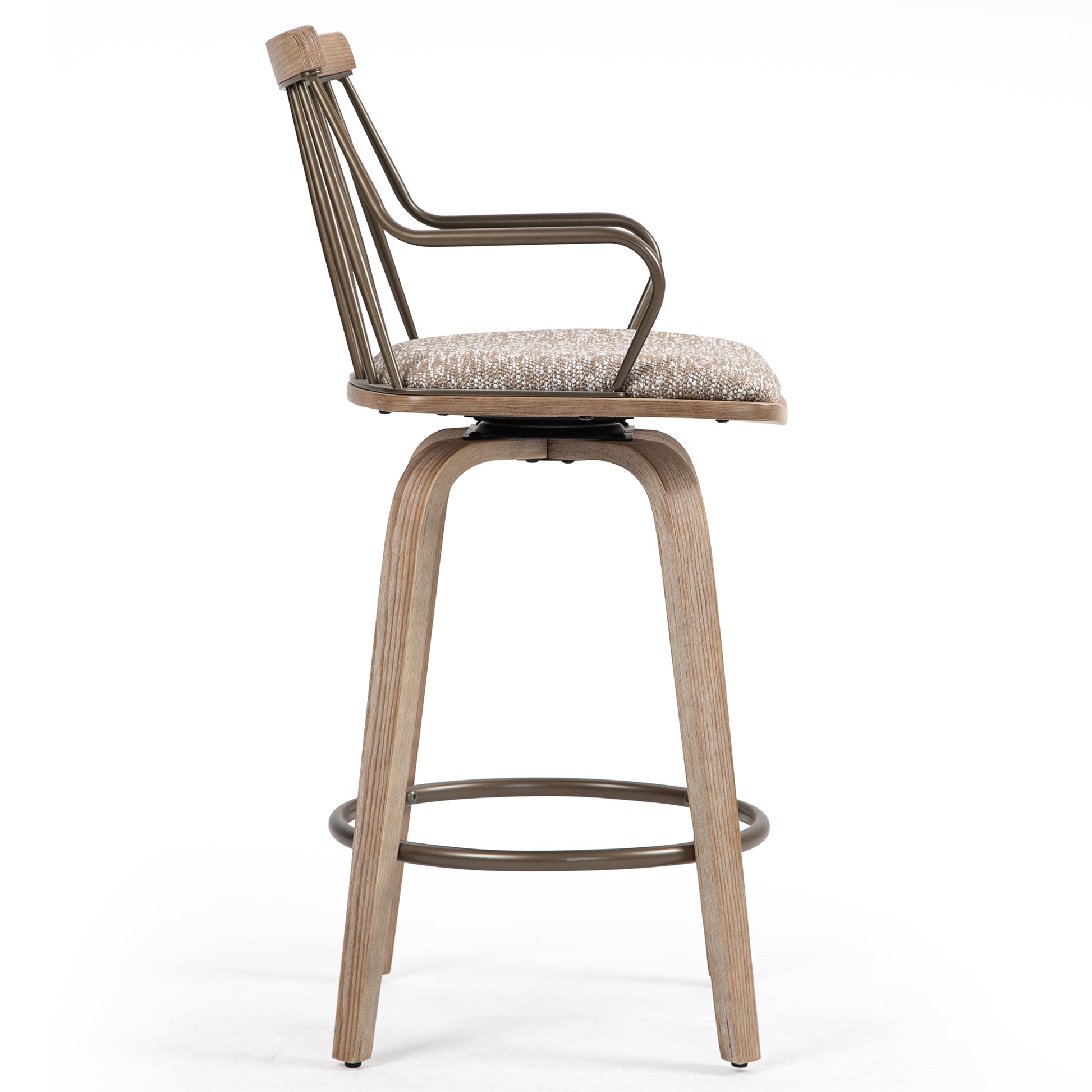 Enhance your kitchen or bar area with our stylish two-toned counter stool. Featuring a unique white and light brown woven fabric design, it boasts a slatted back for added comfort and style. Iron arms provide sturdy support, while a 360-degree rotation allows for easy movement. Complete with an iron footrest for additional comfort, this stool seamlessly combines functionality with elegance for a modern dining experience.