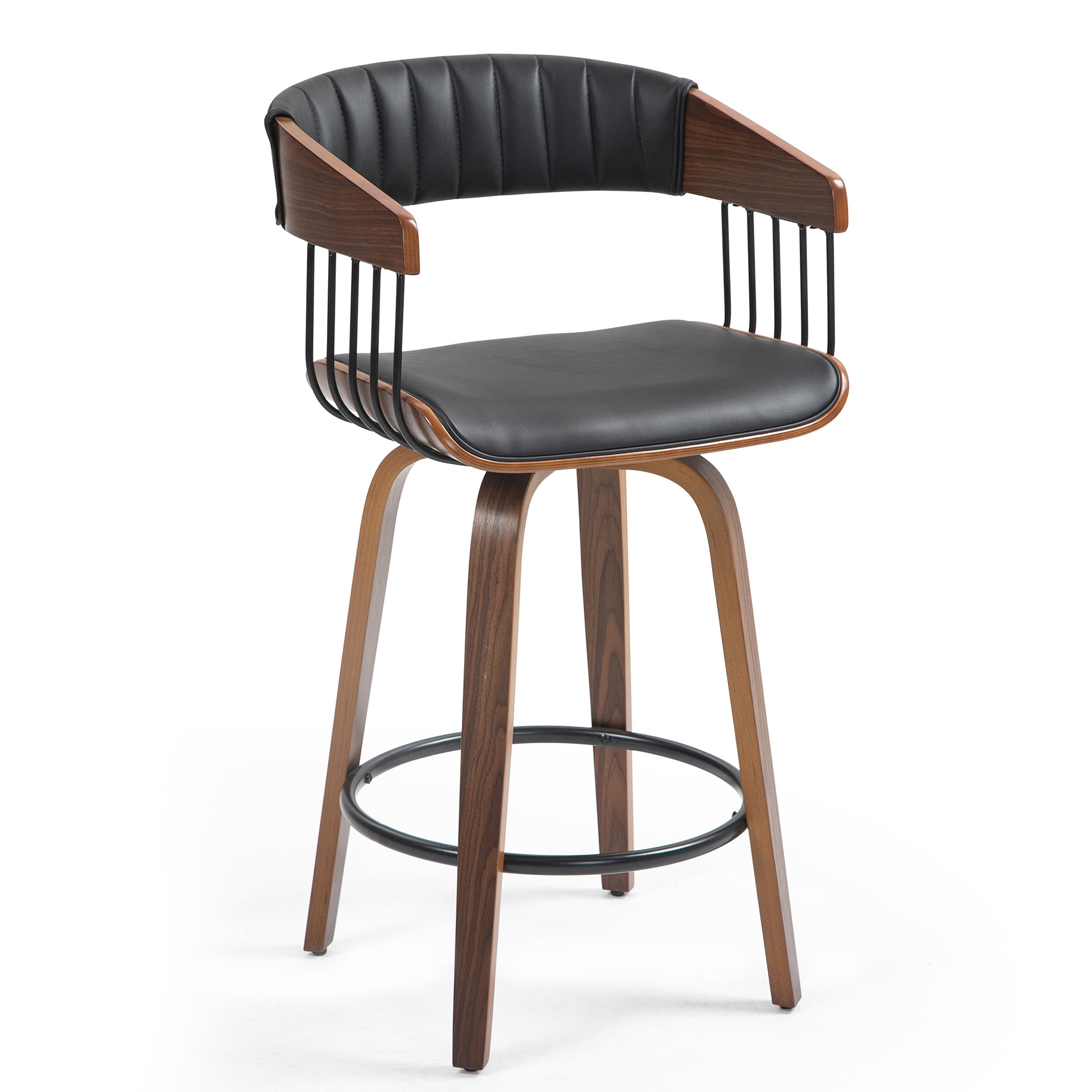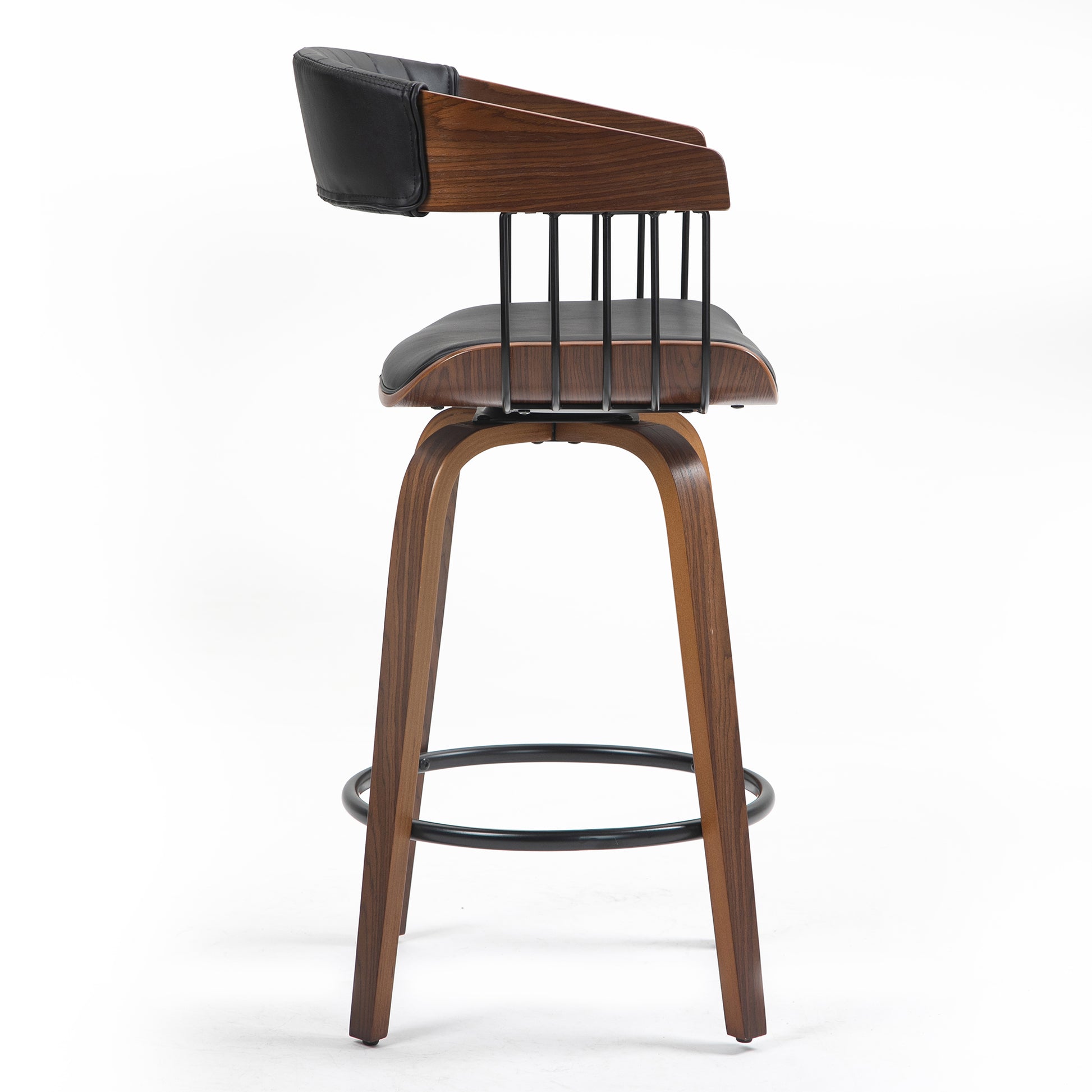 Elevate your dining space with our exquisite black faux leather counter stool. Embrace the fusion of comfort and elegance with walnut wood arms and legs, exuding warmth and sophistication. Iron accent rails and footrest add a modern flair, enhancing its allure. Whether entertaining guests or enjoying a quiet meal, indulge in luxurious comfort and timeless style. Redefine your dining experience with this impeccable piece of furniture.