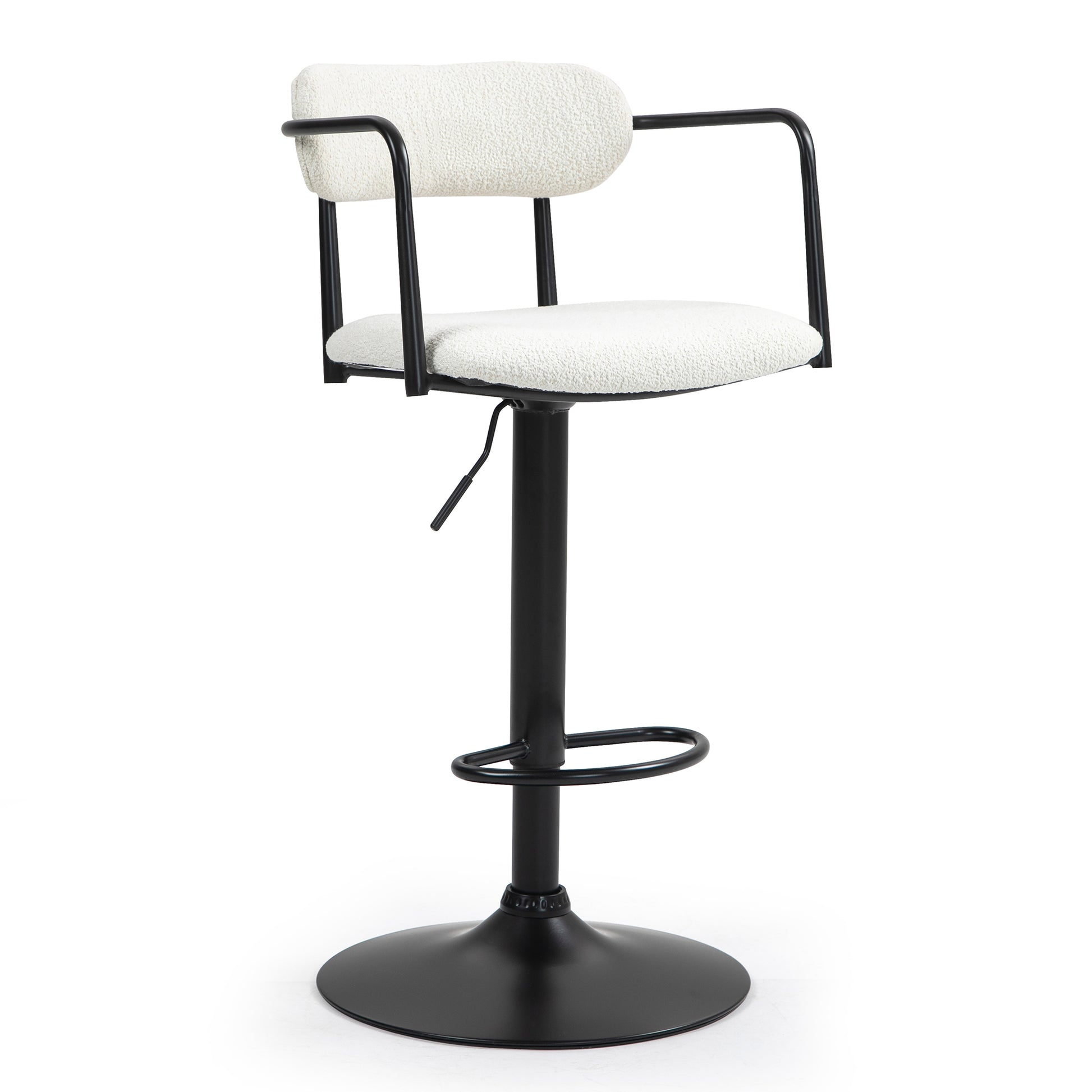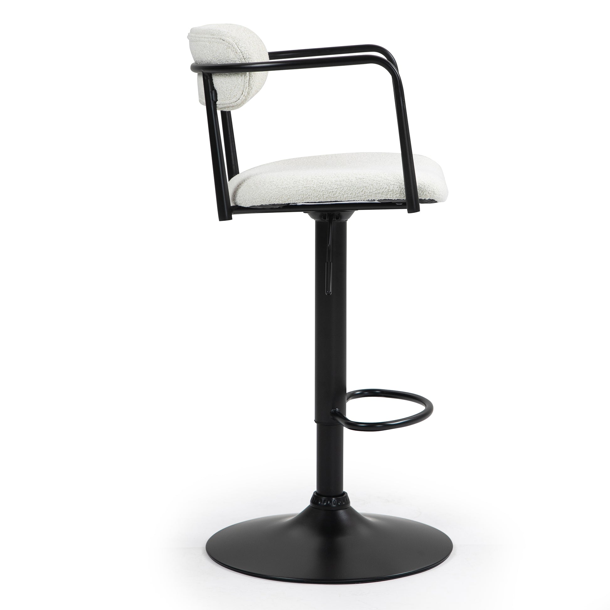 Bedivere Beige Boucle Fabric Adjustable Bar Stool with Black Iron Arms and Pedestal Leg