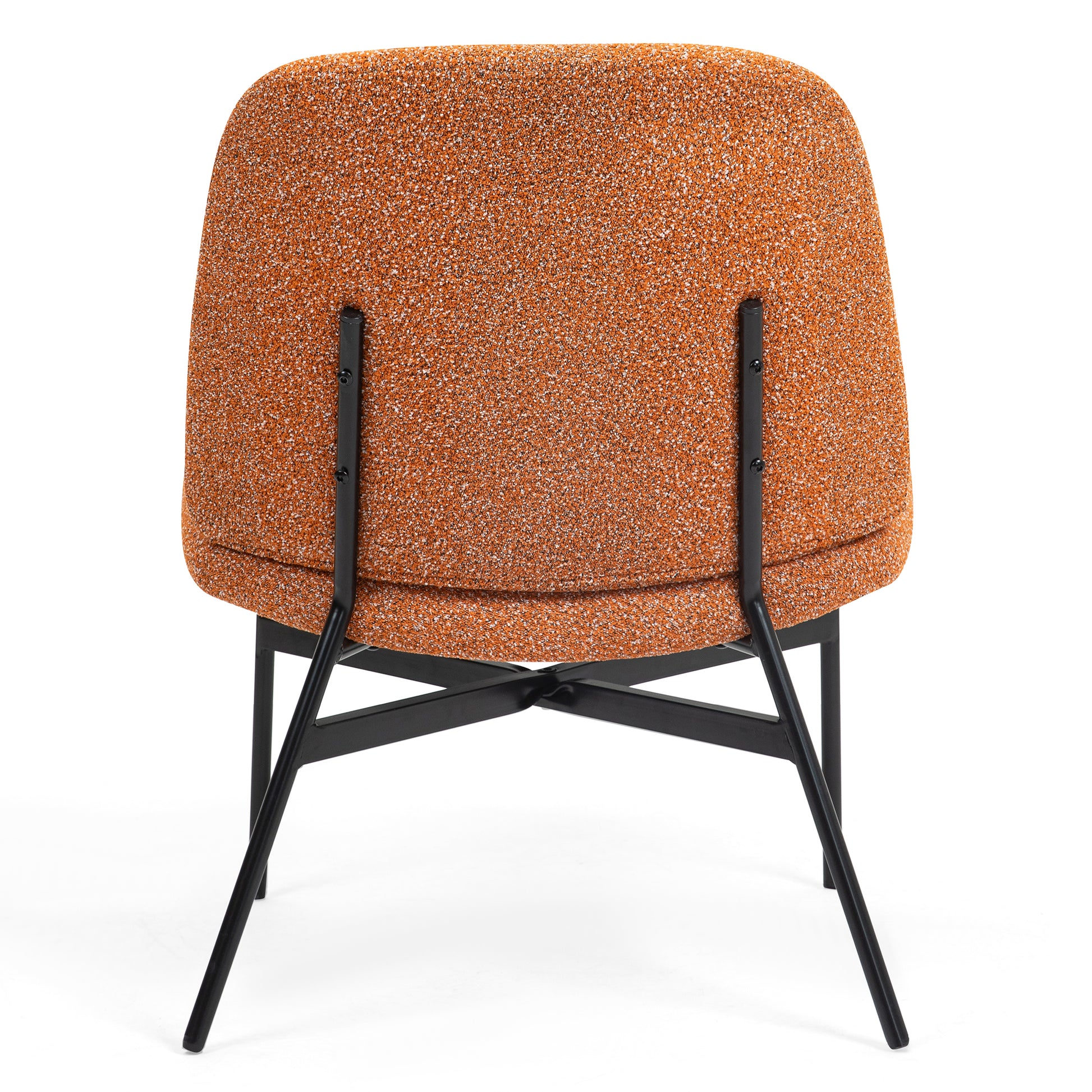 Elevate your interior decor with our exquisite orange upholstered fabric accent chair. Crafted with the utmost attention to detail, this chair features elegant black metal legs that infuse warmth and charm into any space. The plush upholstered fabric provides a soft, luxurious feel. This chair is the perfect blend of style and relaxation, making it a must-have addition to your home.