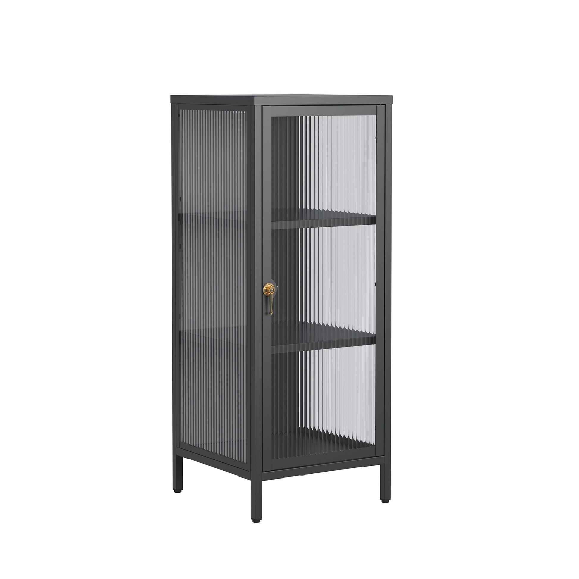 The Benoite Black One Door Storage Cabinet offers a sleek, modern design with a fluted clear door and an elegant modern shape. Featuring three spacious shelves, it combines functionality with style, perfect for any room. The gold handle add additional elegance to the cabinet's modern aesthetic. A stylish and practical storage solution for your home.