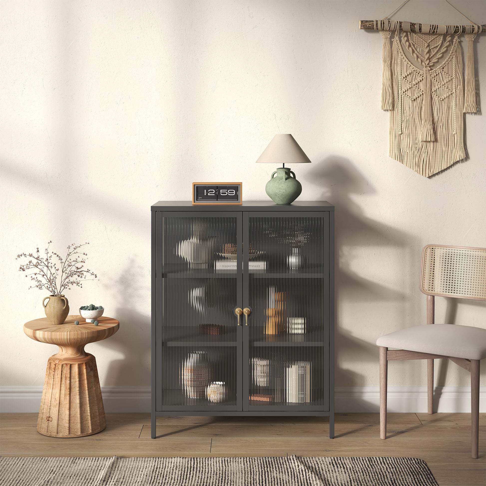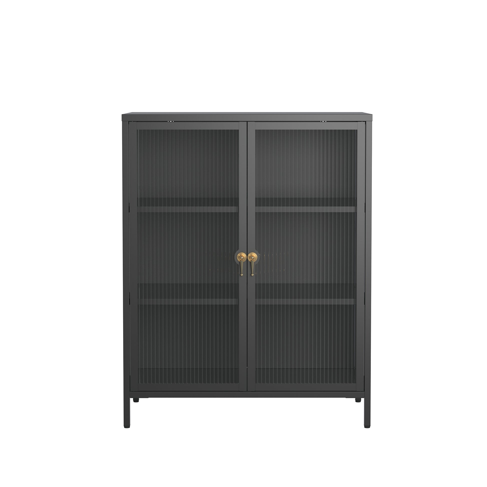 The Benoite Black Two Door Storage Cabinet offers a sleek, modern design with fluted clear doors and an elegant modern shape. Featuring three spacious shelves, it combines functionality with style, perfect for any room. The gold handles add additional elegance to the cabinet's modern aesthetic. A stylish and practical storage solution for your home.