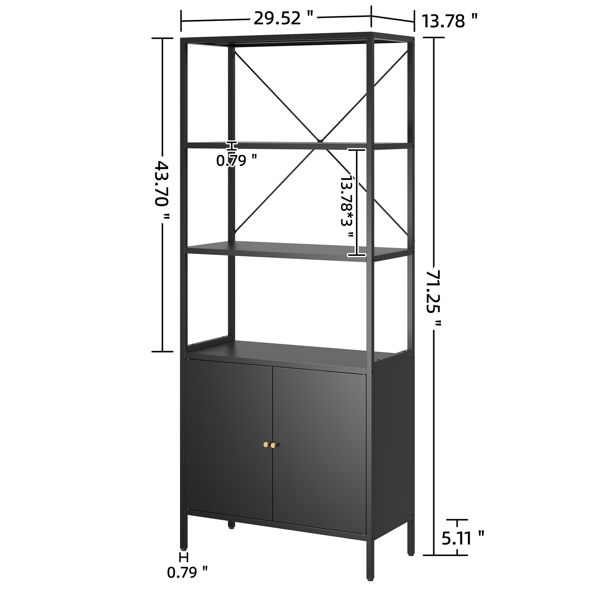 Other Dimensions: Shelf Distance: 13.78"H. Shelf Height: 0.79"H. Leg Dimensions: 0.79"W x 5.11"H. Display Storage: 43.70"H. Closed Storage: 22.44"H. Weight Capacity per Shelf: 60 lbs.
