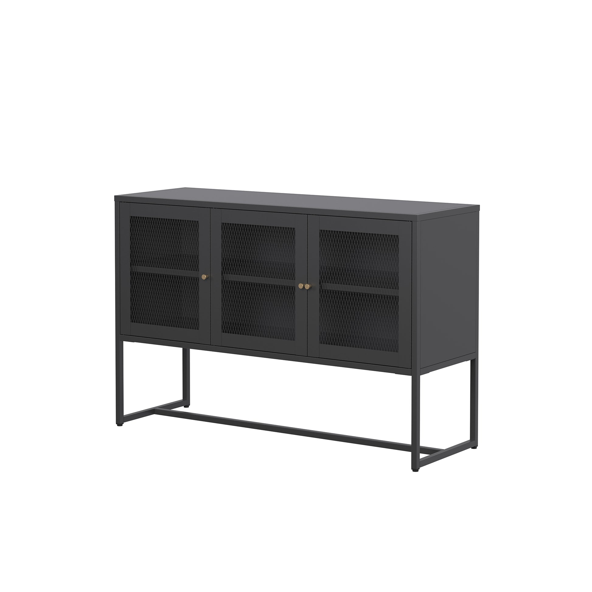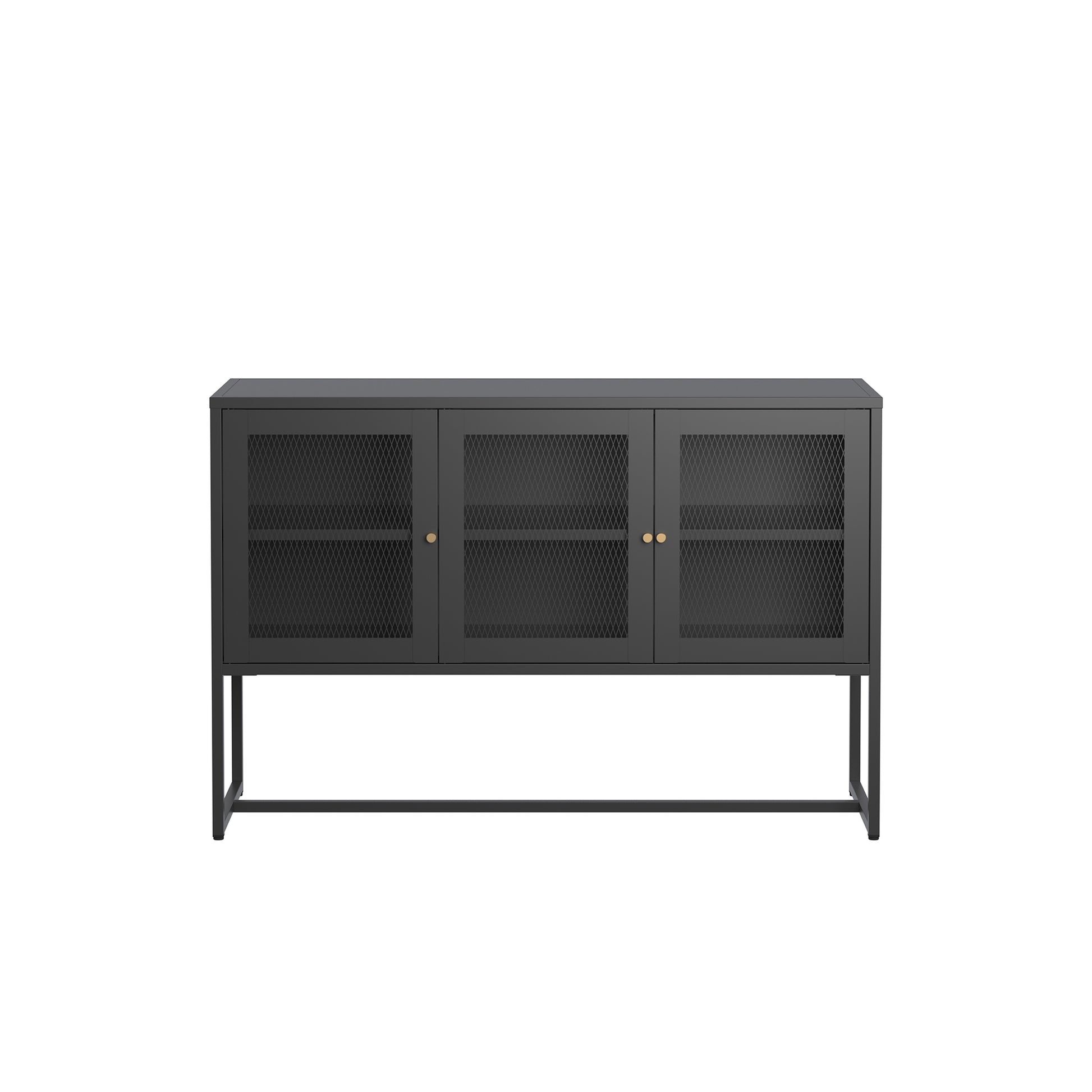 The Bentley Black Three Door Sideboard offers a sleek, modern design with black mesh doors and an elegant modern shape. Featuring two spacious shelves, it combines functionality with style, perfect for any room. The gold knobs add additional elegance to the cabinet's modern aesthetic. A stylish and practical storage solution for your home.