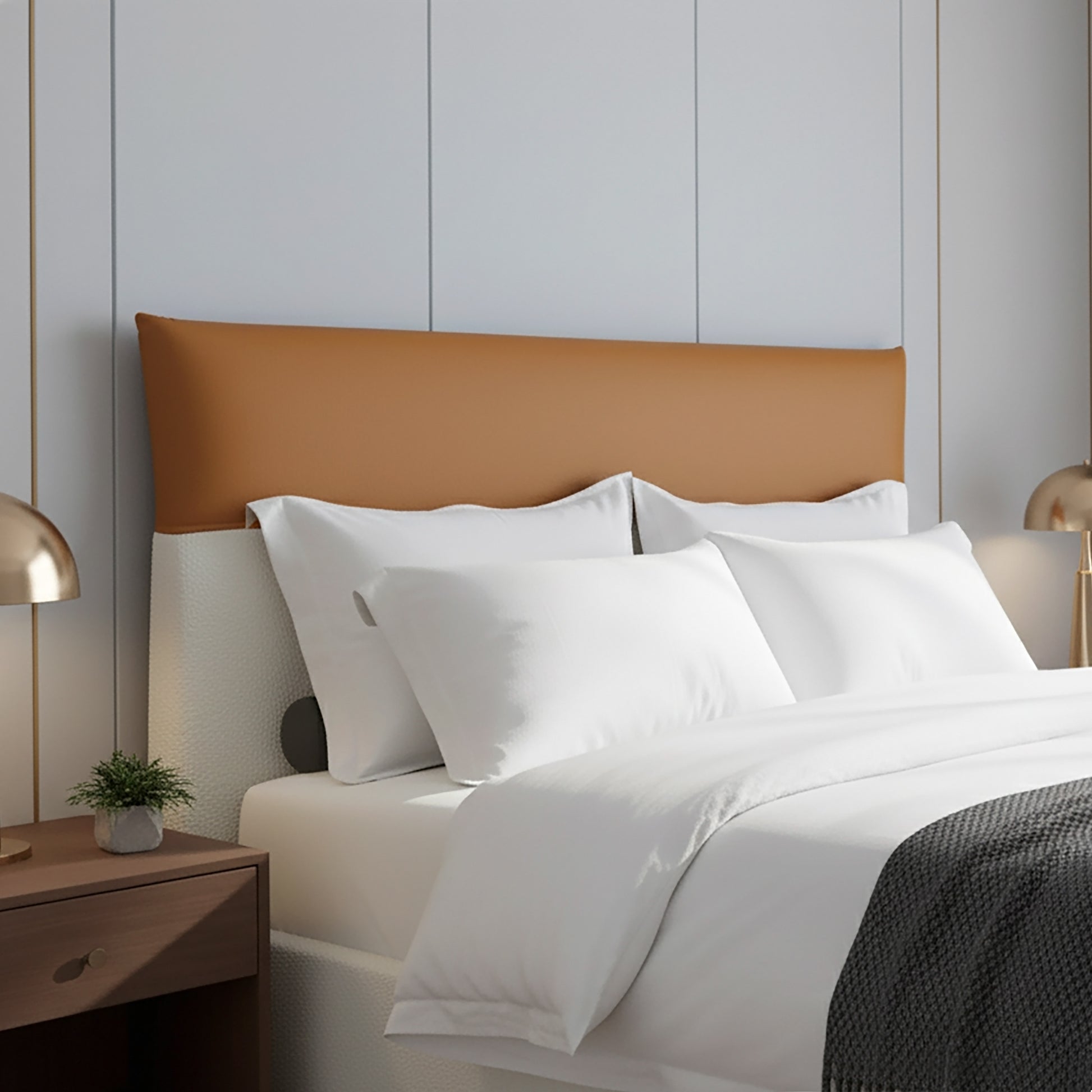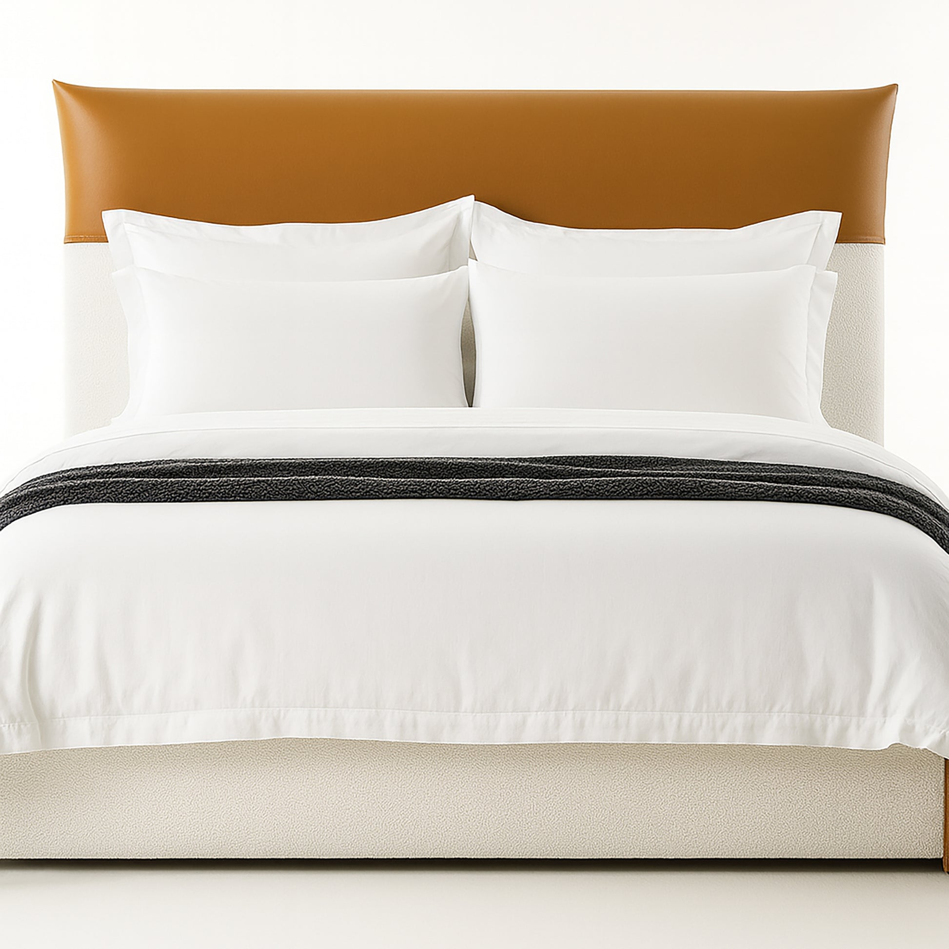 This bed presents a refined blend of modern elegance and minimalist design. Its bold, two-tone headboard, with the upper section upholstered in a rich caramel brown material that adds warmth and sophistication, while the lower section is covered in a soft, textured white boucle fabric for a clean and calming contrast. Complementing the headboard, the bed’s base is wrapped in the same soft white fabric, accented by caramel brown corner details that unify the design. Altogether, this bed is a perfect balance of comfort, elegance, and contemporary charm.
