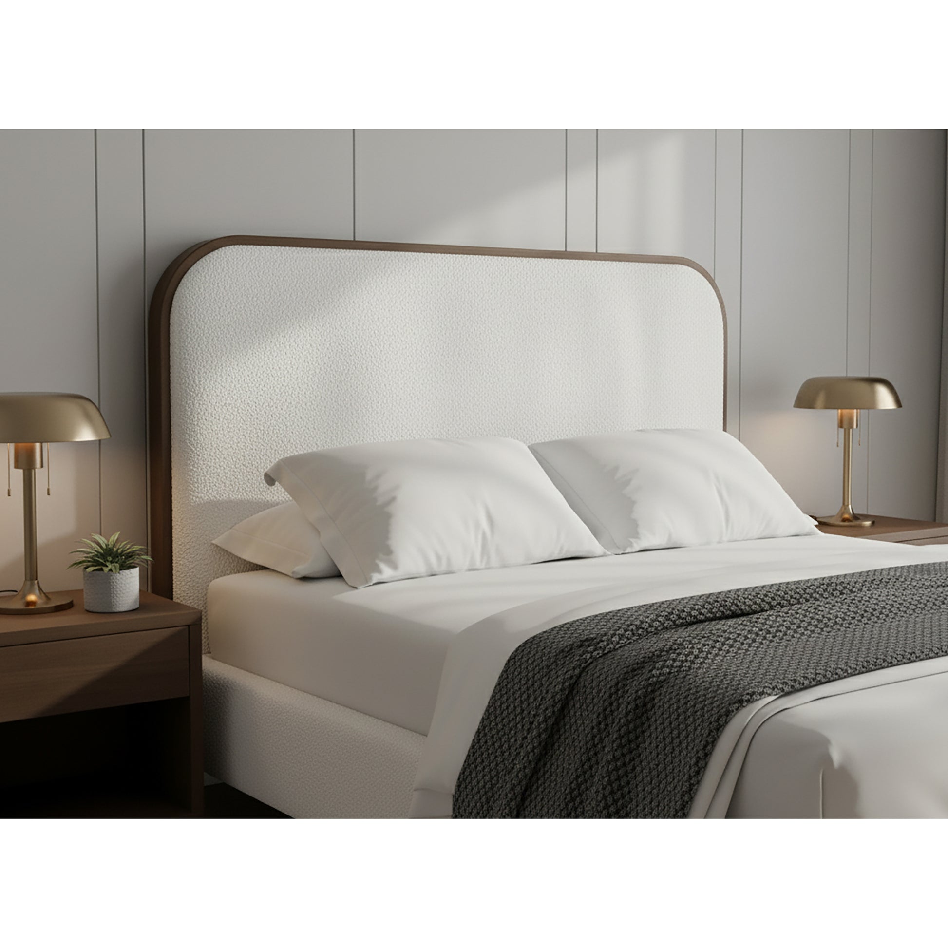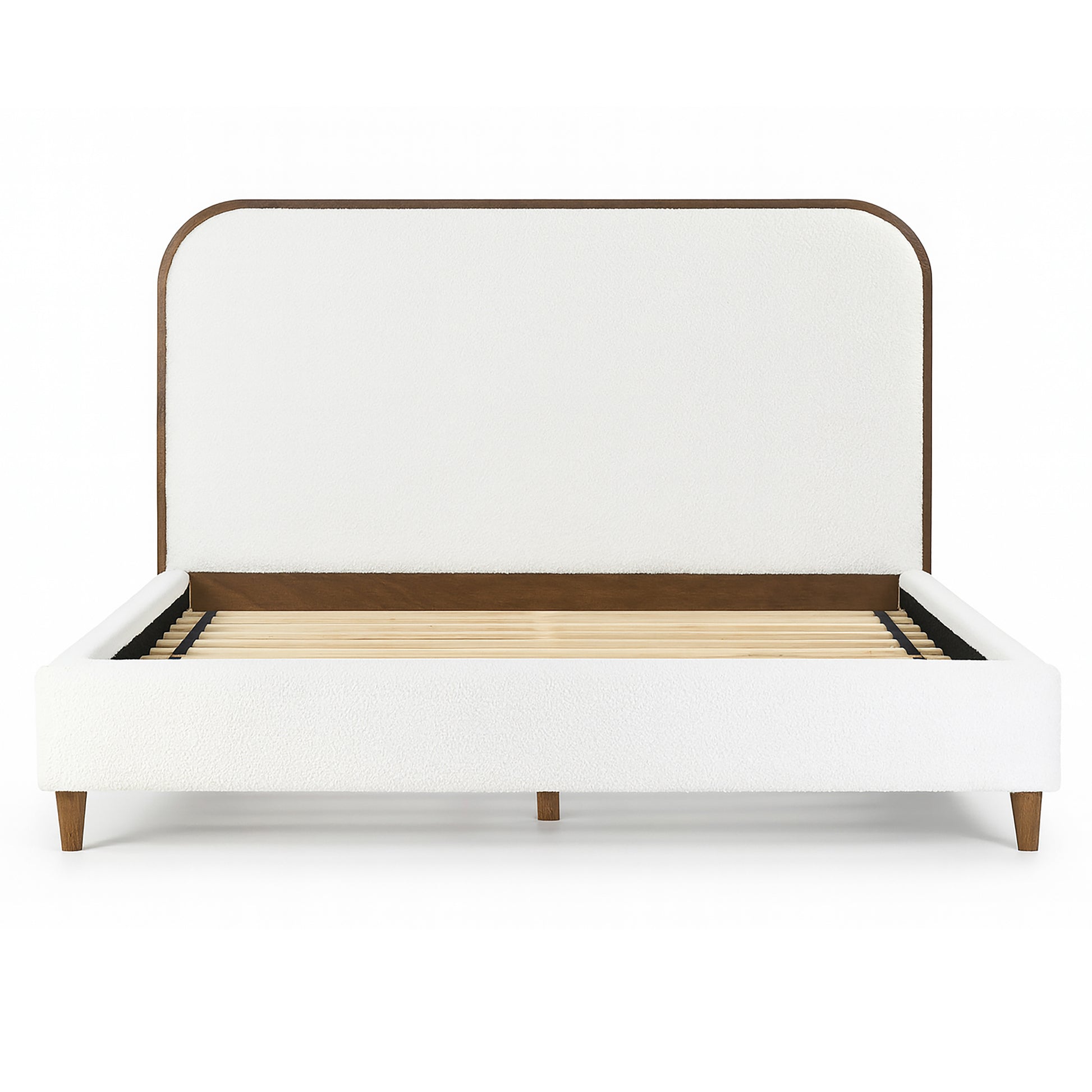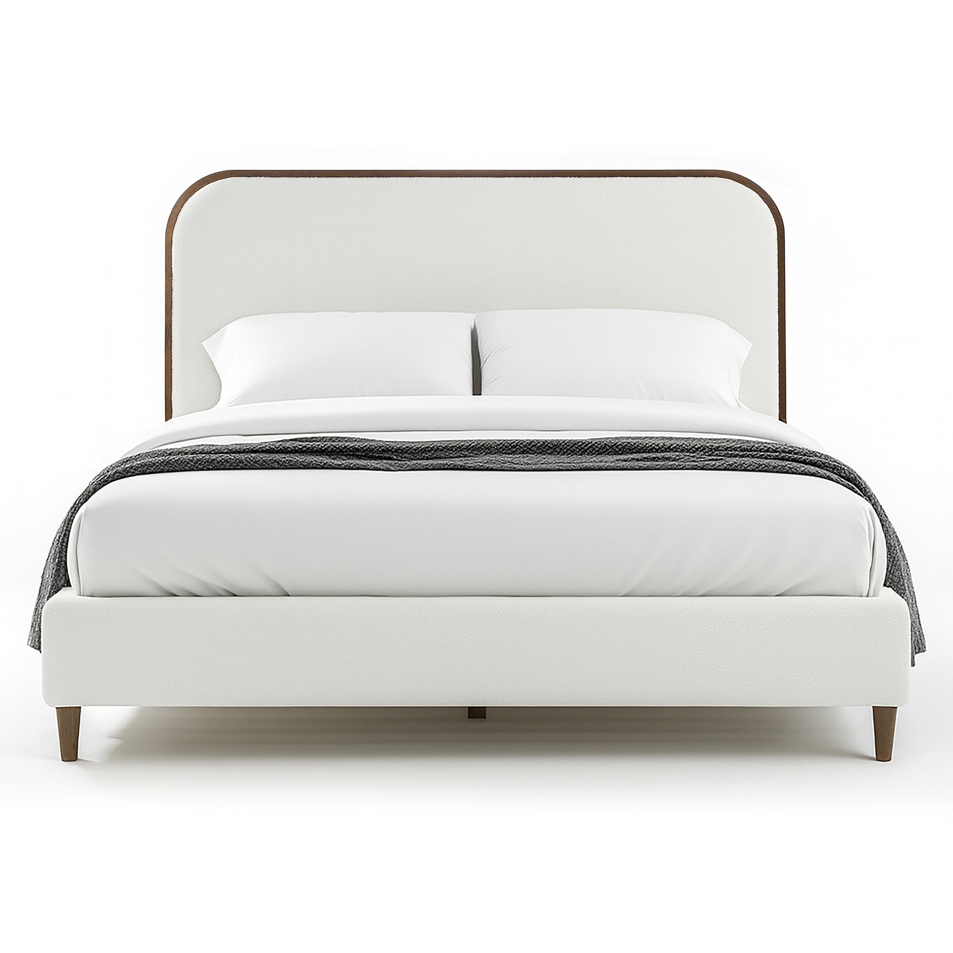 This bed frame showcases a sleek, contemporary design that effortlessly combines comfort with sophistication. Upholstered in a soft boucle fabric, the frame and tall headboard offer a clean, minimalist aesthetic, while the gently rounded corners add a touch of softness to the overall look. A warm wood trim subtly outlines the headboard, providing an elegant contrast and highlighting the craftsmanship of the piece. The tapered wood legs elevate the structure, enhancing its airy, modern feel and ensuring stability. With its refined silhouette and neutral palette, this bed serves as a versatile centerpiece, perfectly suited for a wide range of bedroom styles.