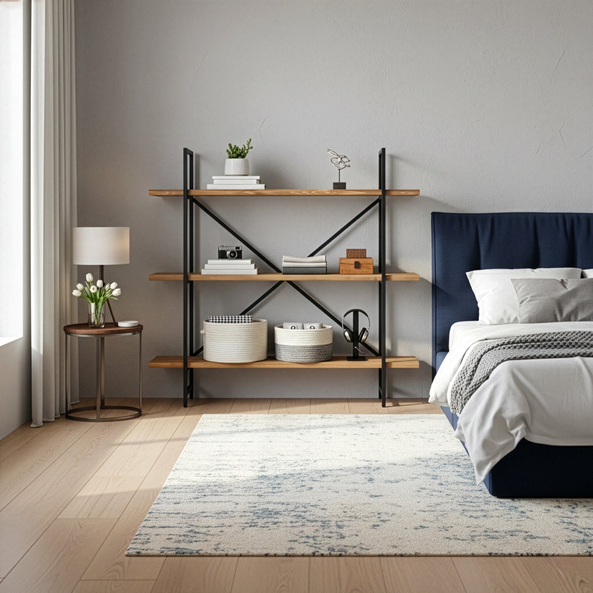 Chic, simple, versatile and durable, this etagere bookcase has it all. Black metal frame and three full shelves made of pine wood create a modern industrial look. Three extra wide shelves provide generous organization space, as well as add style to your room.