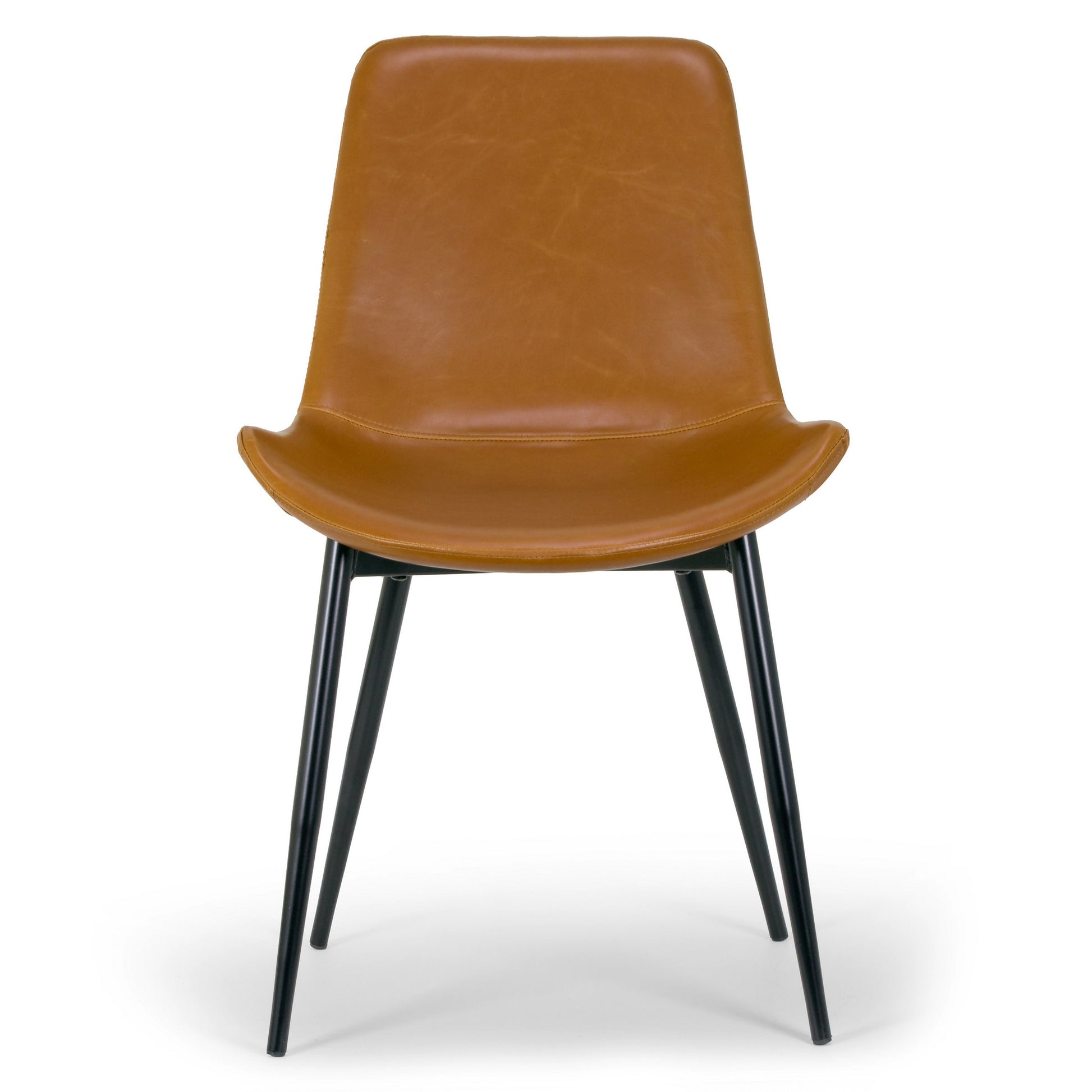 This is a dining chair with refined modern style and quality craftsmanship. Slightly curved seat is upholstered with caramel brown faux leather. Black iron legs are steady and durable. Can be easily cleaned with dry cloth. Assembly needed.