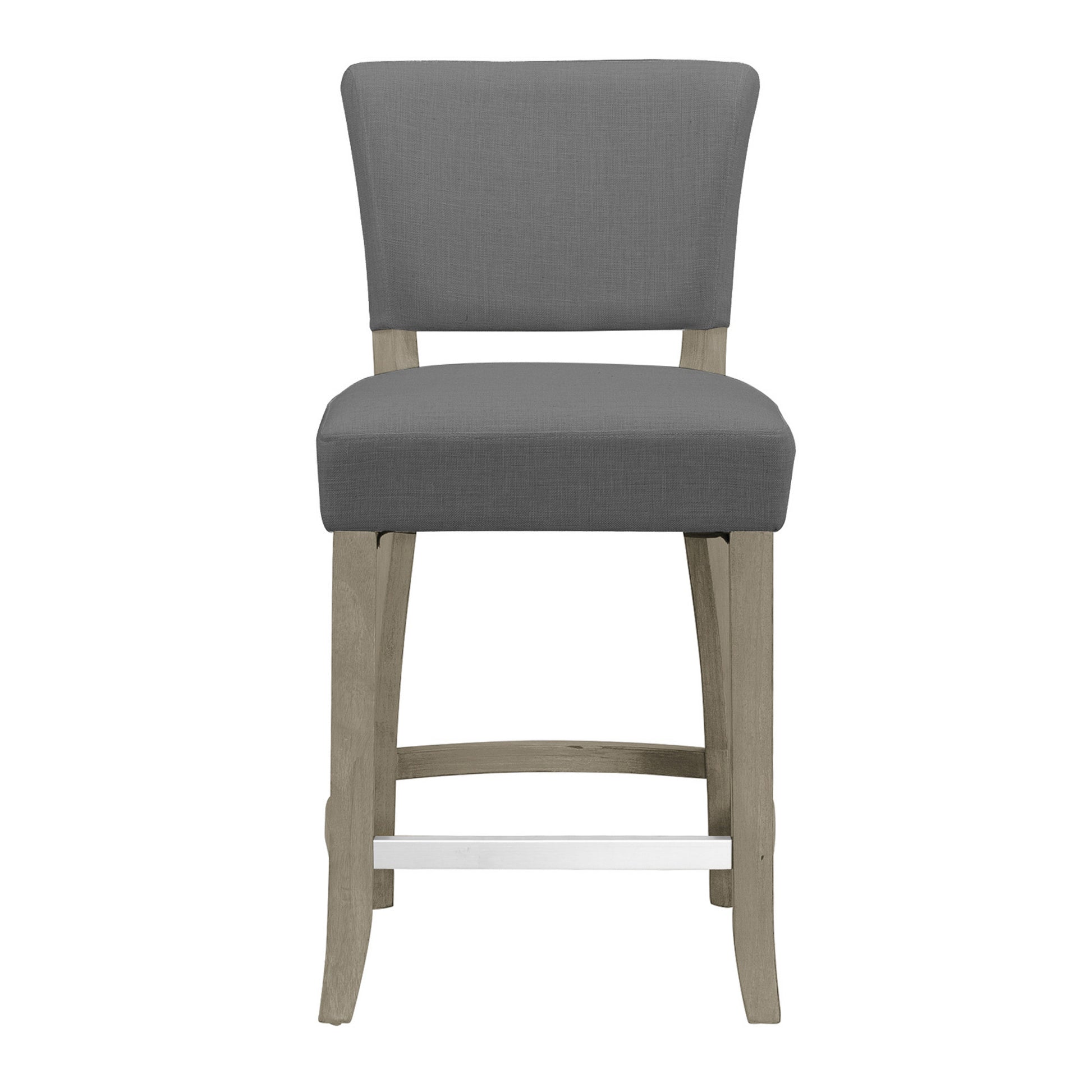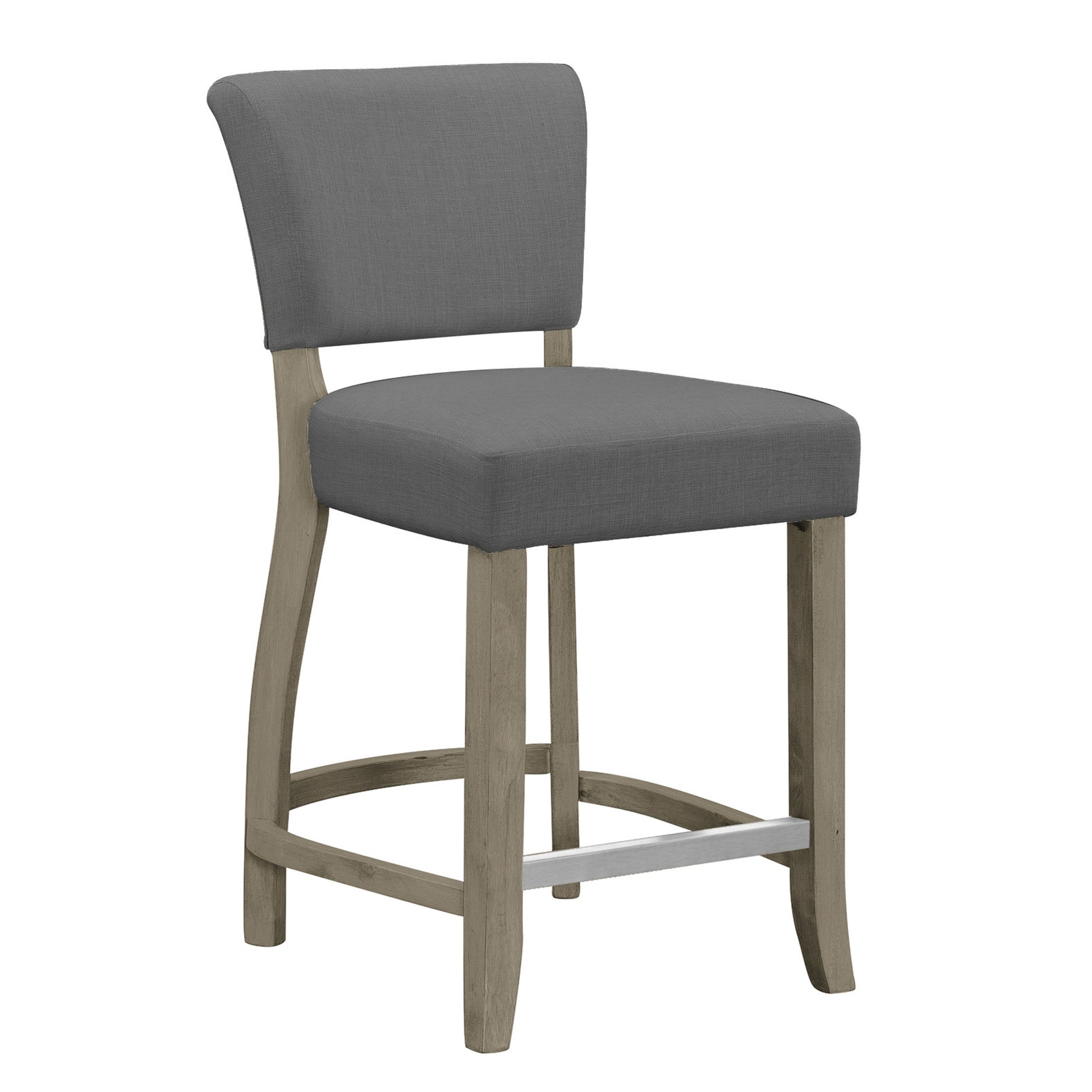 Classic grey fabric counter stool with high quality craftsmanship. Are you looking for a comfortable upholstered stool but do not want too many details? This may be the option for you. Simple yet classic design finished with versatile grey fabric upholstery. Antique finished wood legs and frame offer stability and durability. Footrest is added for better sitting experience and better structure integrity. This stool is counter height. The same design is also available at bar height (sold separately). Minor assembly needed. Spot clean recommended.