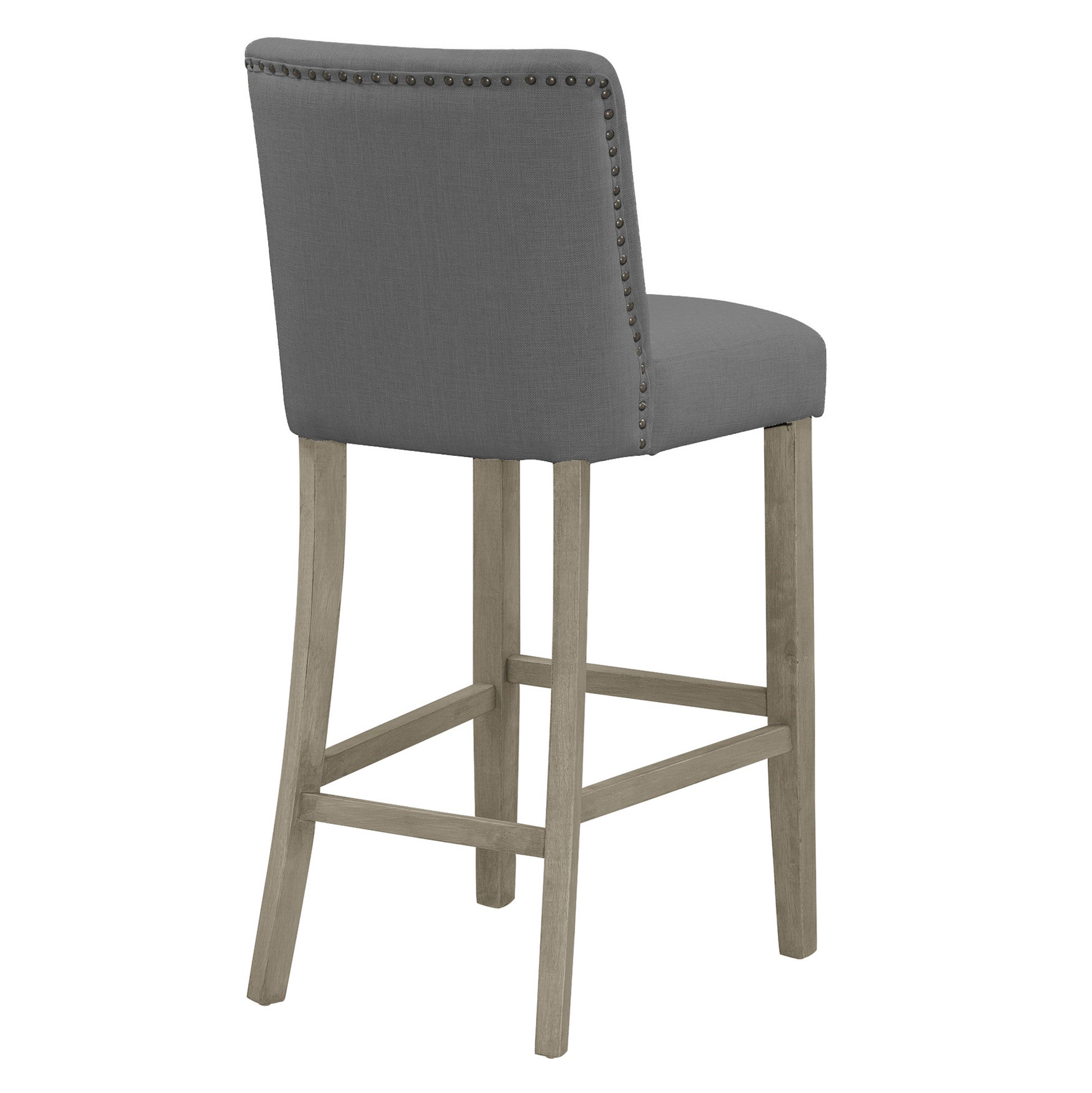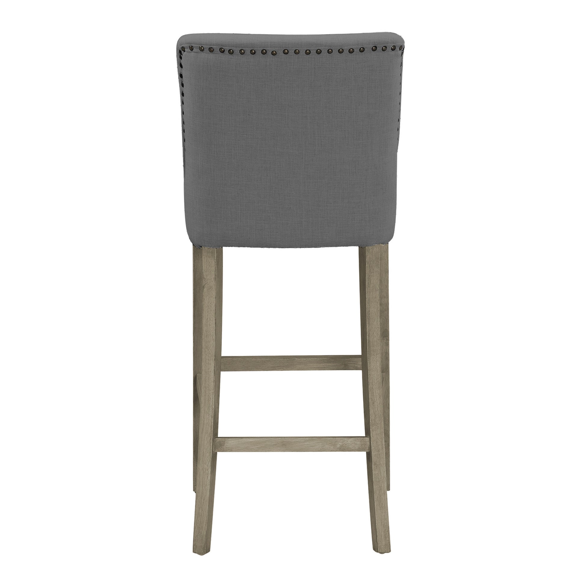 Chic fabric barstool with beautiful nail head details on the back and sides. Grey fabric upholstered counter stool would match any décor, while metal nail head decorates and accents. Quality wood and fabric is used for durability. Every detail is added with care. Wood legs are finished with antique color. Footrest is added for better sitting experience and better structure integrity. This stool is of bar height. The same design is also available at counter height (sold separately). Minor assembly needed. Spot clean recommended.