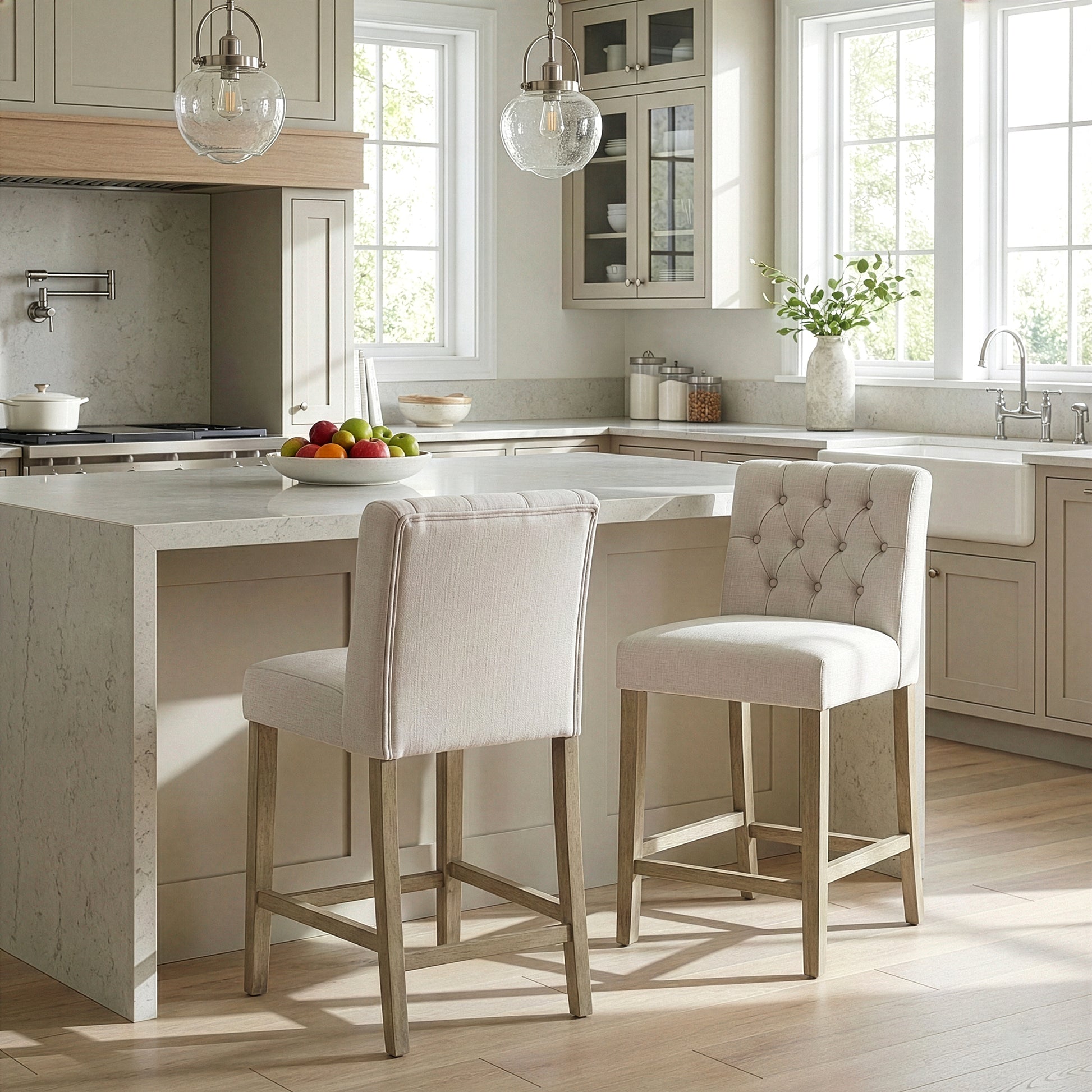 Set of 2 Aled Beige Fabric Counter Stool with Side Wings and Tufted Buttons