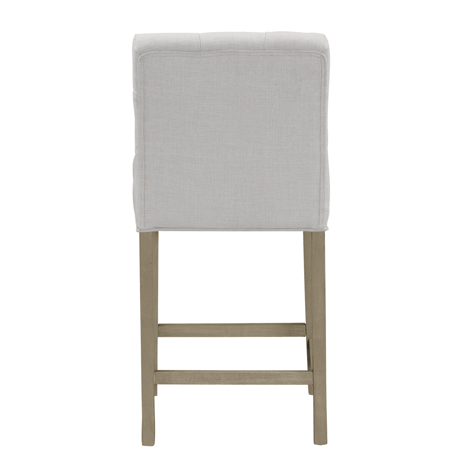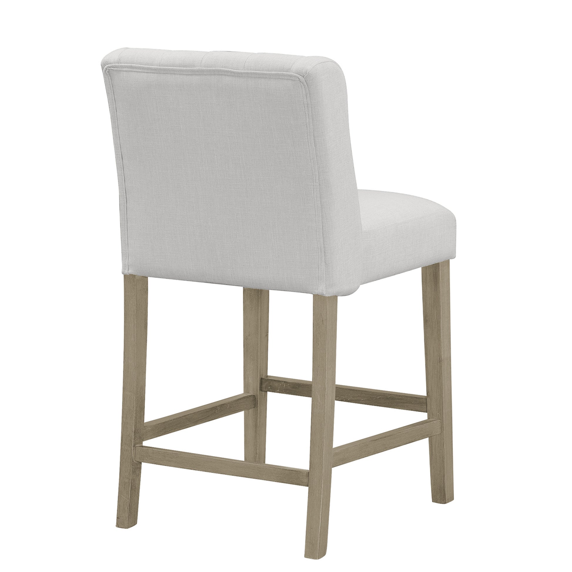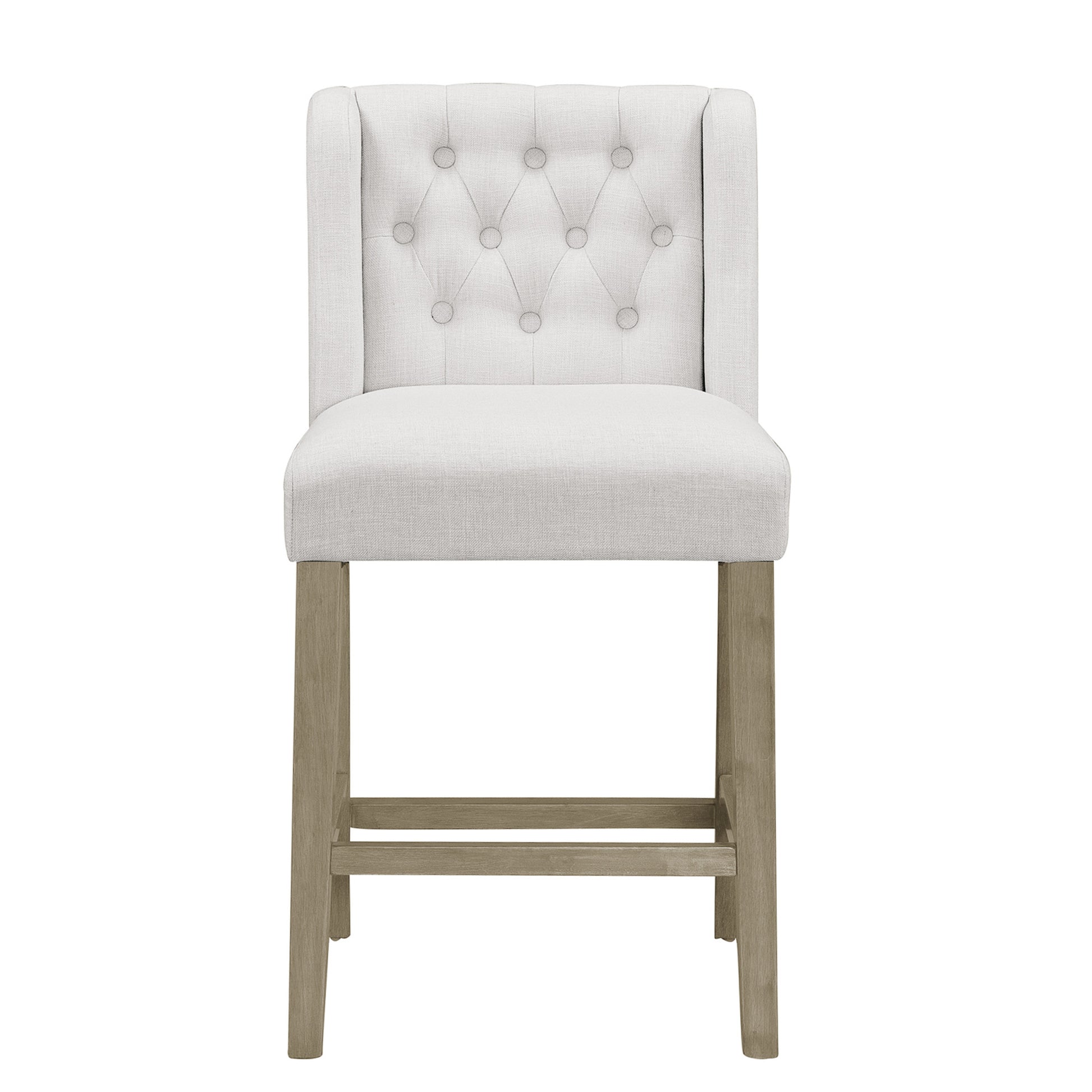 This counter stool with small side wings and tufted buttons can surely become a stylish addition to your room. Beige fabric upholstery, high-density foam cushion, proper footrest, as well as the wood legs guarantee comfortable seating. Chic side wings and tufted buttons complete this stool with style. This stool is at counter height. The same design is also available at bar height (sold separately). Minor assembly needed. Spot clean recommended.