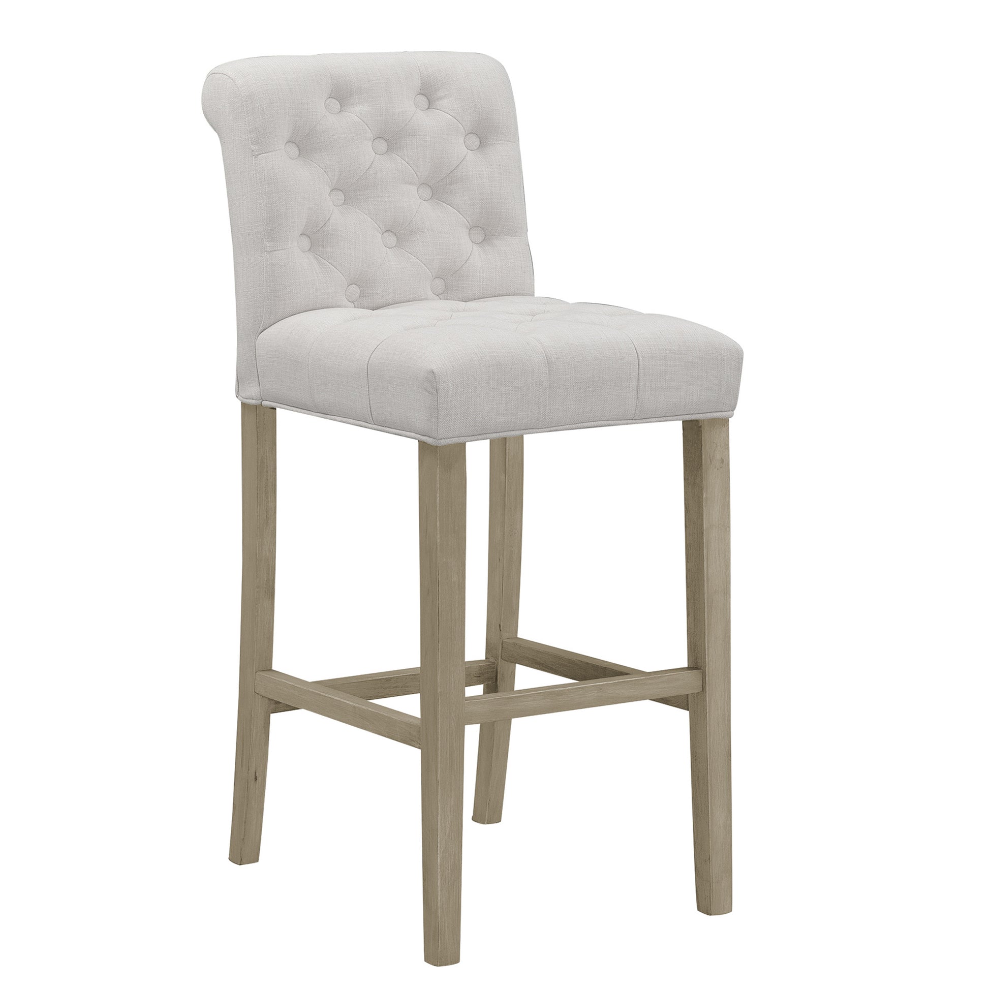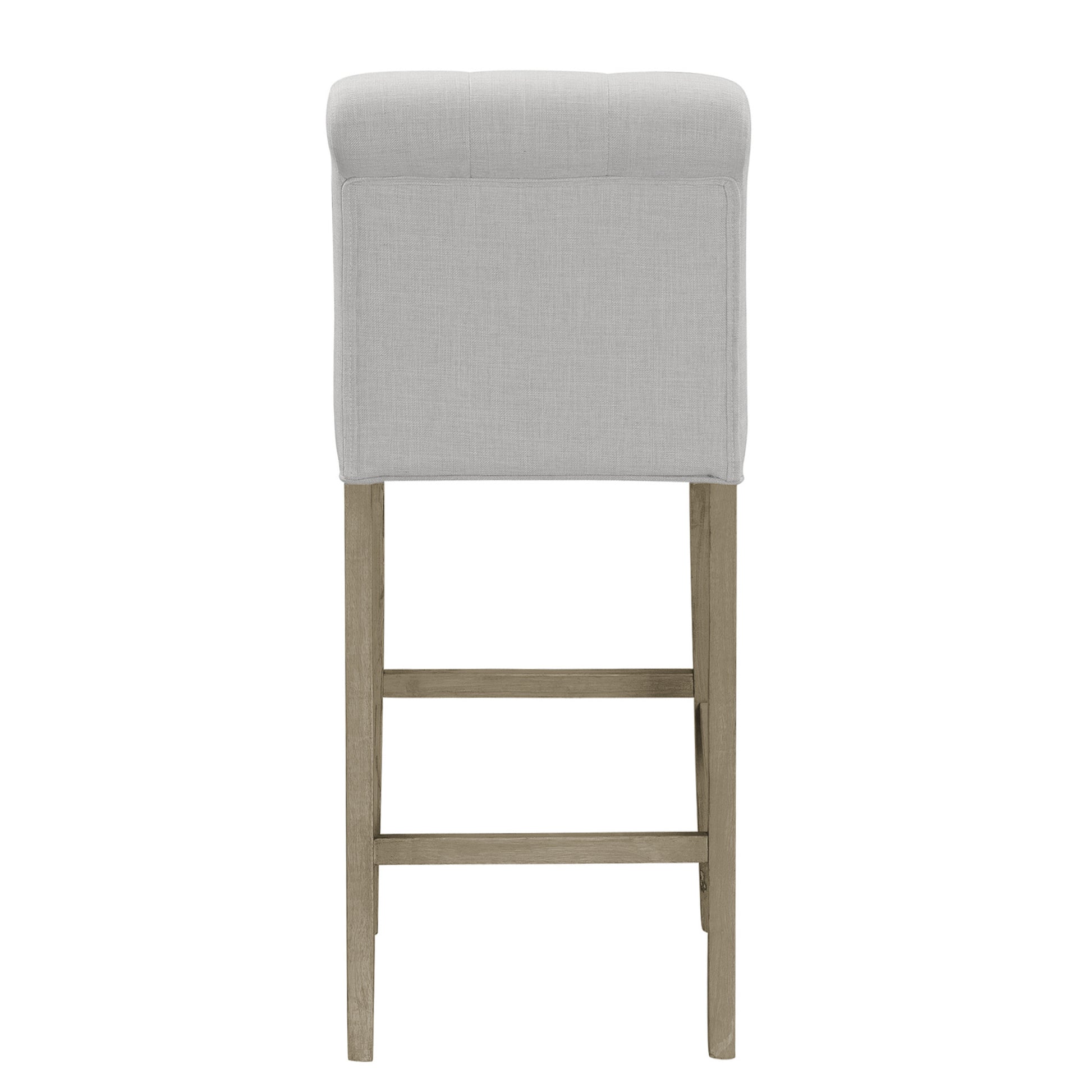 This roll back beige fabric barstool can surely become a stylish addition to your room. Quality fabric upholstery, high-density foam cushion, as well as the wood footrest and legs guarantee comfortable seating. Chic roll back design and button tufted back complete this stool with style. This stool is at bar height. The same design is also available at counter height (sold separately). Minor assembly needed. Spot clean recommended.