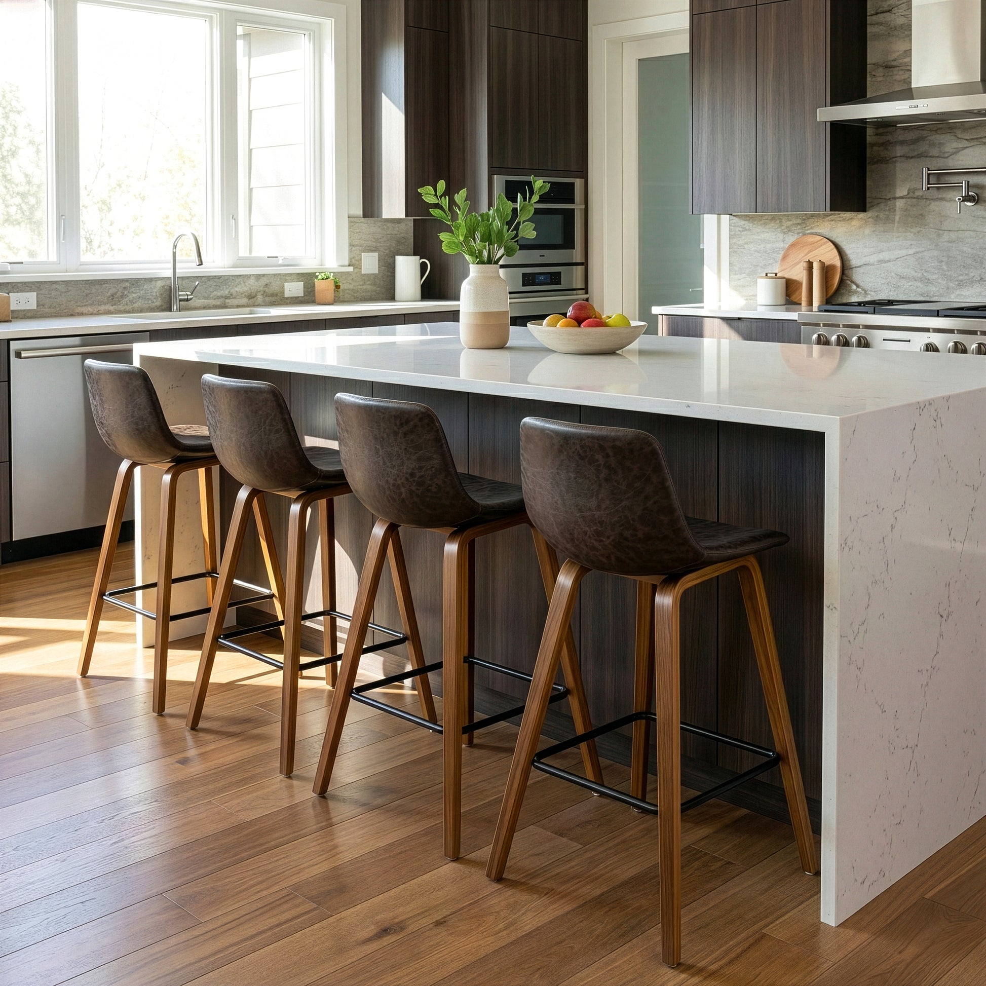 Set of 2 Alyn Modern Brown Barstool with Walnut Finish plywood Legs and Metal Footrest