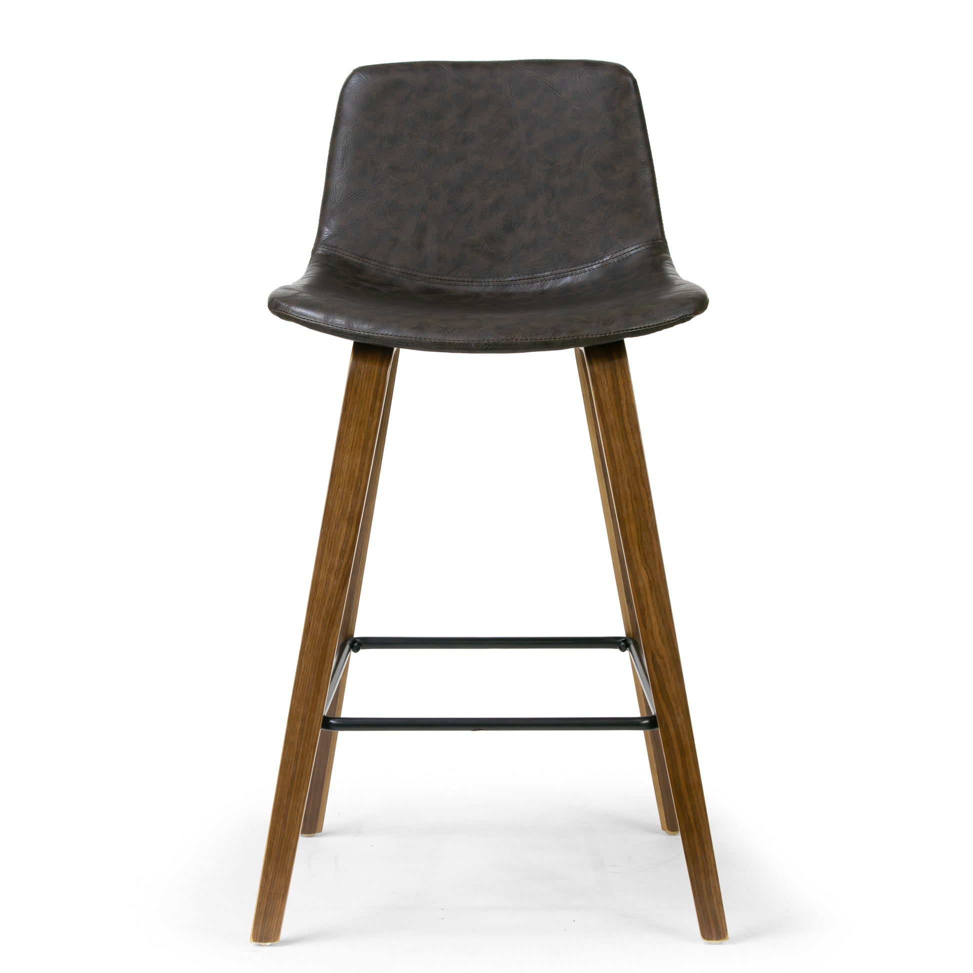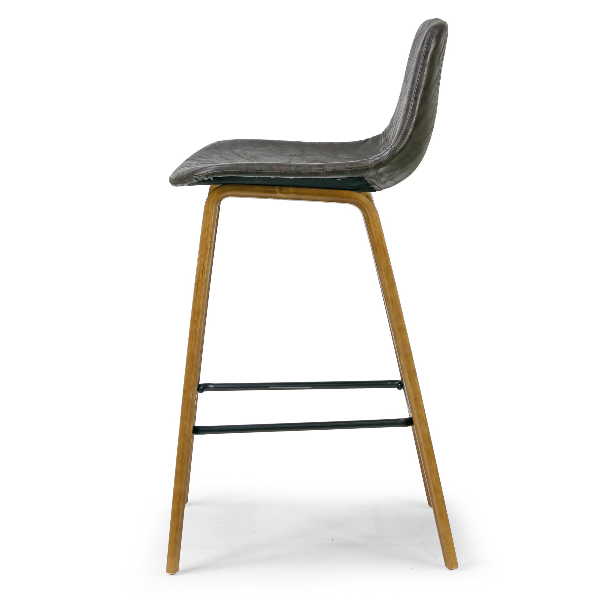 Modern design with a twisted of details, this bar stool will surely become the center piece of your bar. This armless bar stool is upholstered with vintage brown faux leather, which compliments the walnut finish plywood bentwood frame and legs, as well as the black metal footrest. Elegant design, clear cut lines and supreme craftsmanship make this stool the perfect option for you. Assembly needed. Wipe clean with dry cloth.