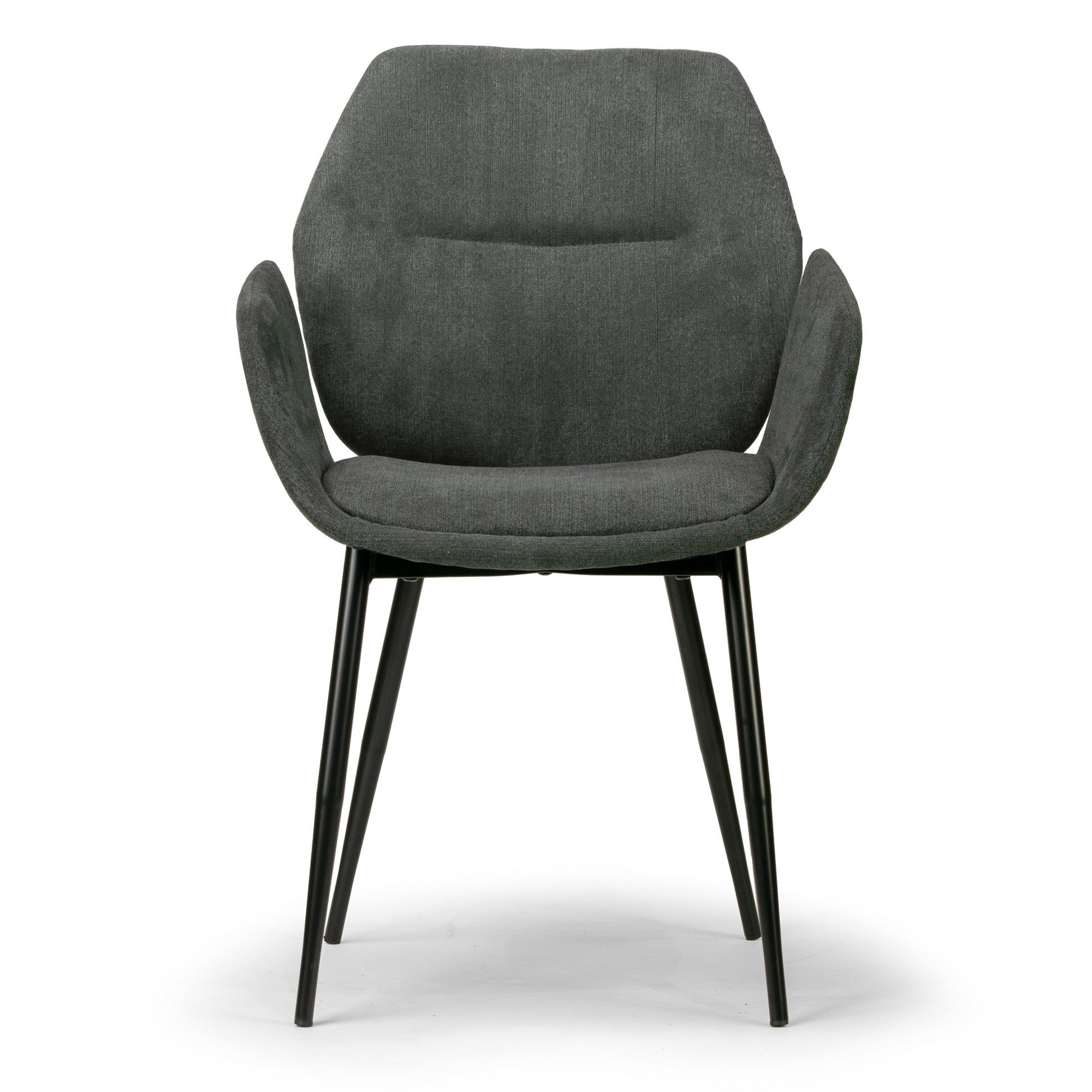Modern arm dining chair completed with grey velvety fabric and black metal legs. Clear cut lines state a modern contemporary taste, while armed design and upholstered seating provide comfort for seating. Black metal frame and legs are sturdy and durable. Minor assembly needed. Spot clean recommended.