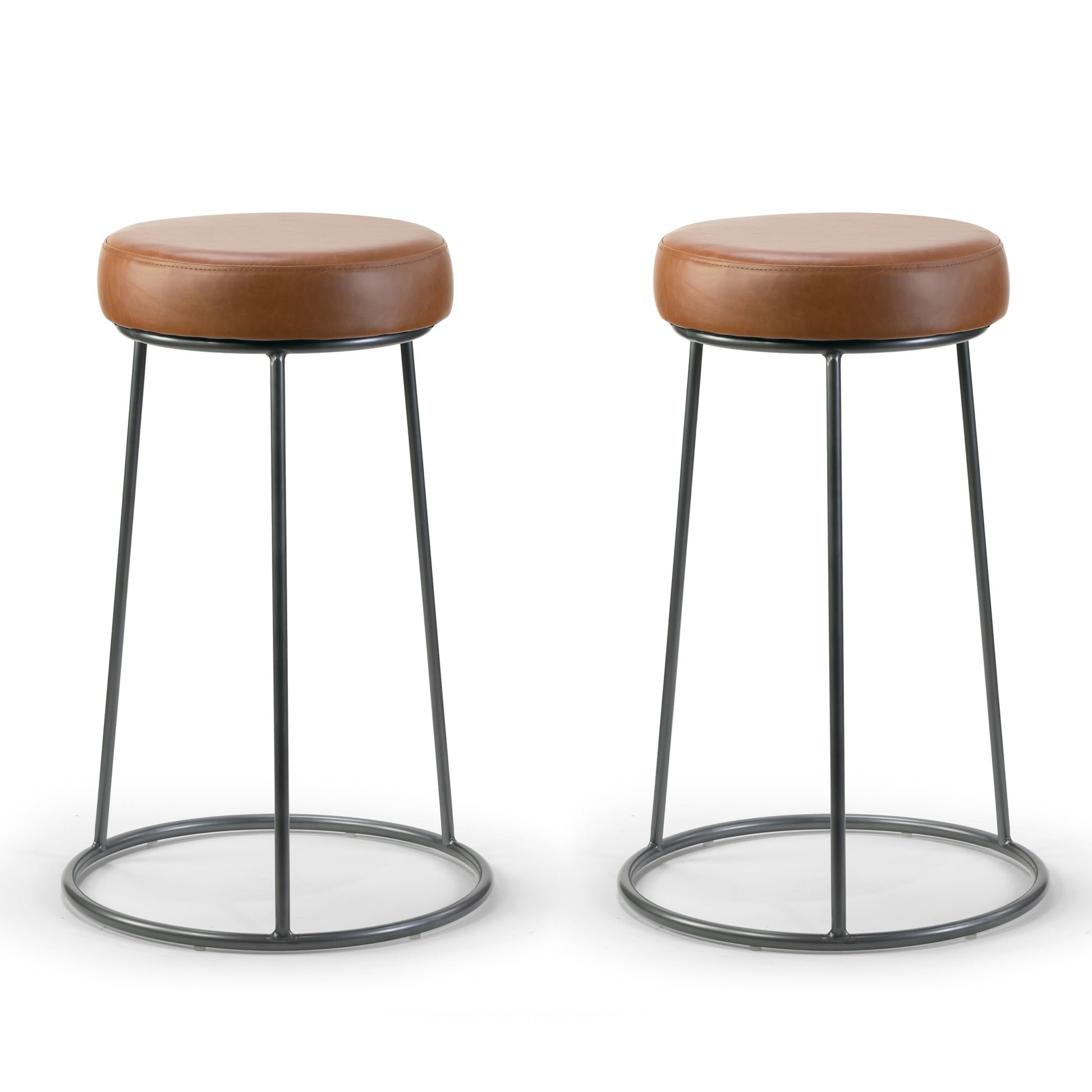 Round backless counter stool with brown upholstery and gunmetal grey frame. Backless round design creates a bold modern statement with ease. Brown faux leather upholstery and grey finish metal frame guarantee quality. Clean modern design is elegant and chic. Minor assembly needed. Floor protectors attached to the bottom of frame. Wipe clean with dry cloth.