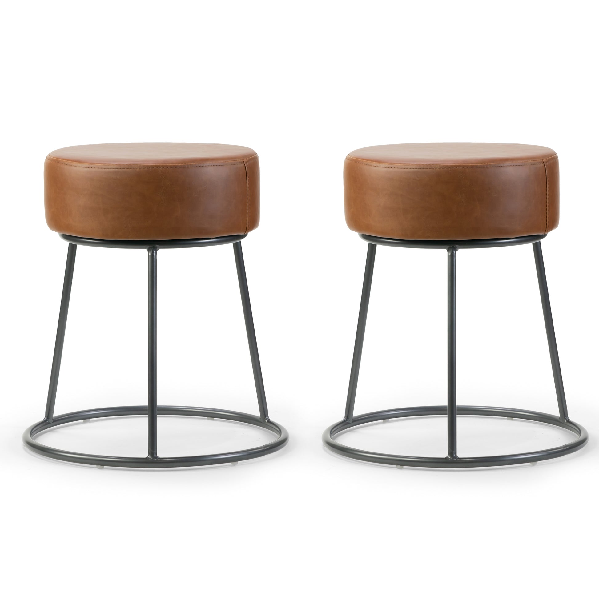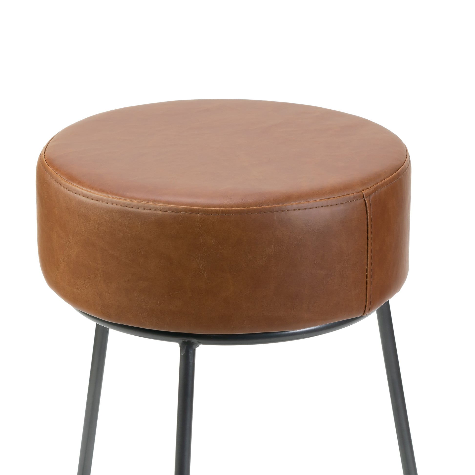 Round stool shaped backless dining chair with brown upholstery and gunmetal grey frame. Backless round design creates a bold modern statement with ease. Brown faux leather upholstery and grey finish metal frame guarantee quality. Clean modern design is elegant and chic. Minor assembly needed. Floor protectors attached to the bottom of frame. Wipe clean with dry cloth.