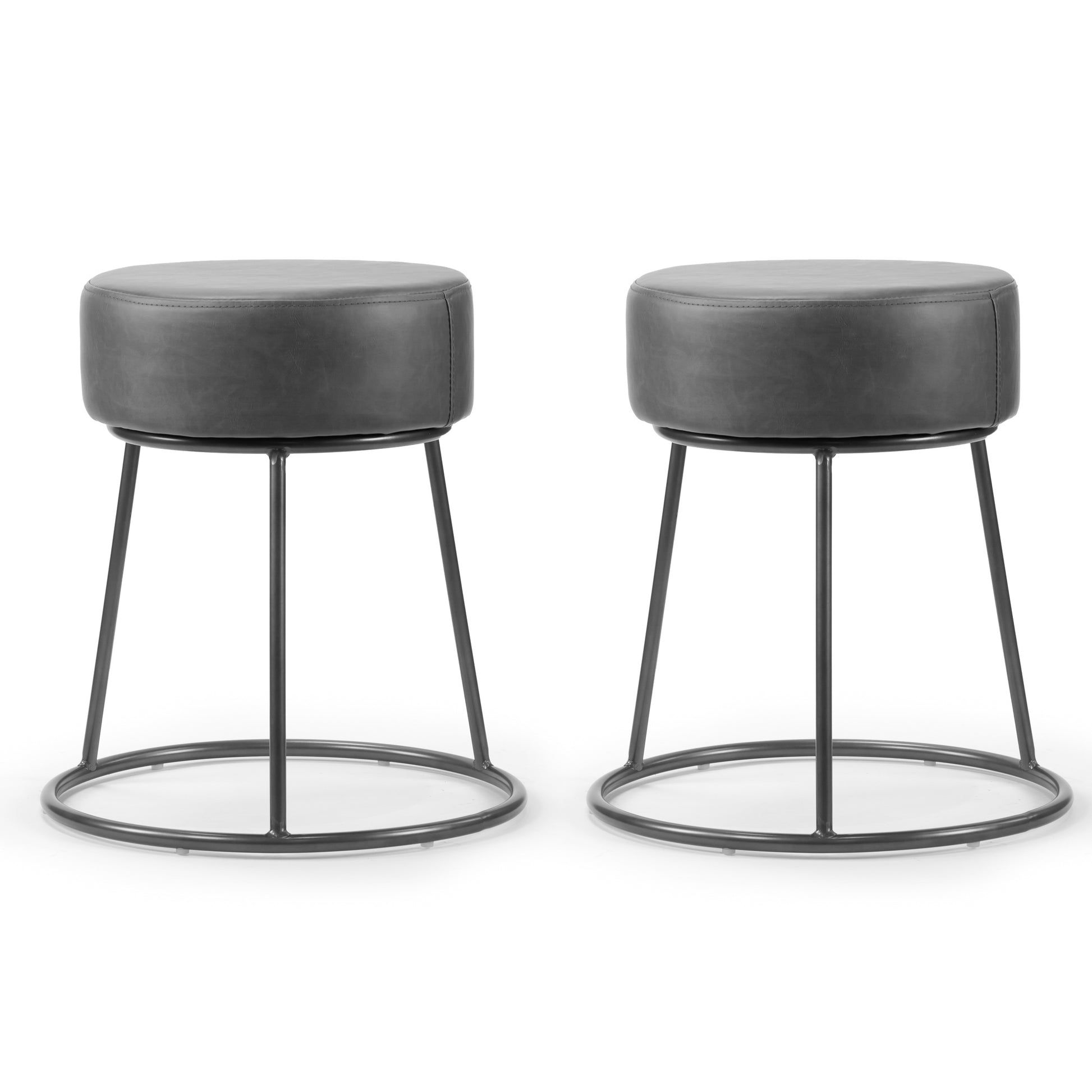 Round stool shaped backless dining chair with grey upholstery and gunmetal grey frame. Backless round design creates a bold modern statement with ease. Grey faux leather upholstery and grey finish metal frame guarantee quality. Clean modern design is elegant and chic. Minor assembly needed. Floor protectors attached to the bottom of frame. Wipe clean with dry cloth.