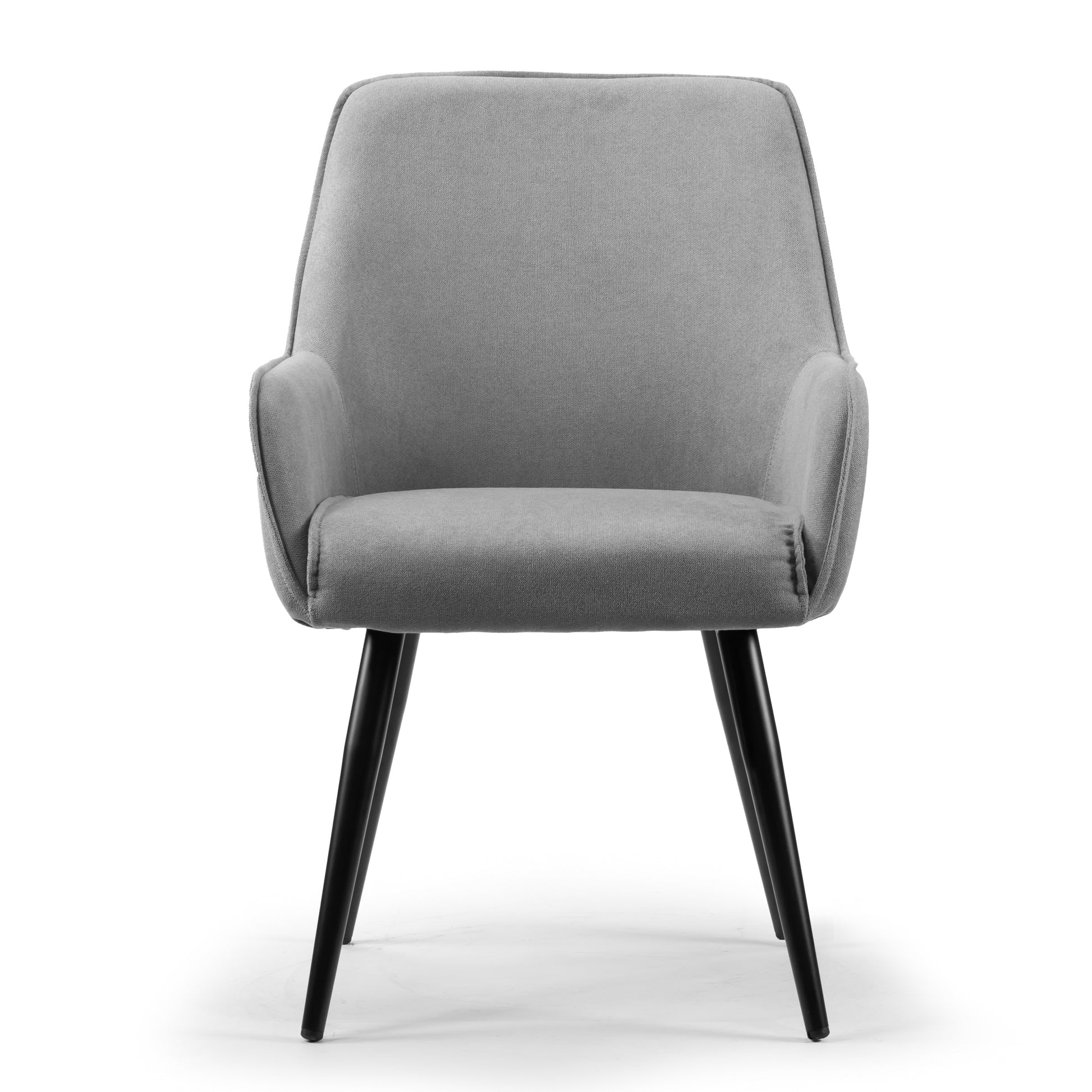 Light grey fabric upholstered dining chair with square arms and black finish steel legs. Made with steel frame and legs, this chair is to last years. It also offers comfortable seating with soft quality fabric upholstery, arm rest, and medium firmness foam cushion. Neutral color scheme matches every décor, while squared arm design makes this chair special. Minor assembly needed. Floor protectors attached to the bottom of the legs. Spot clean recommended.