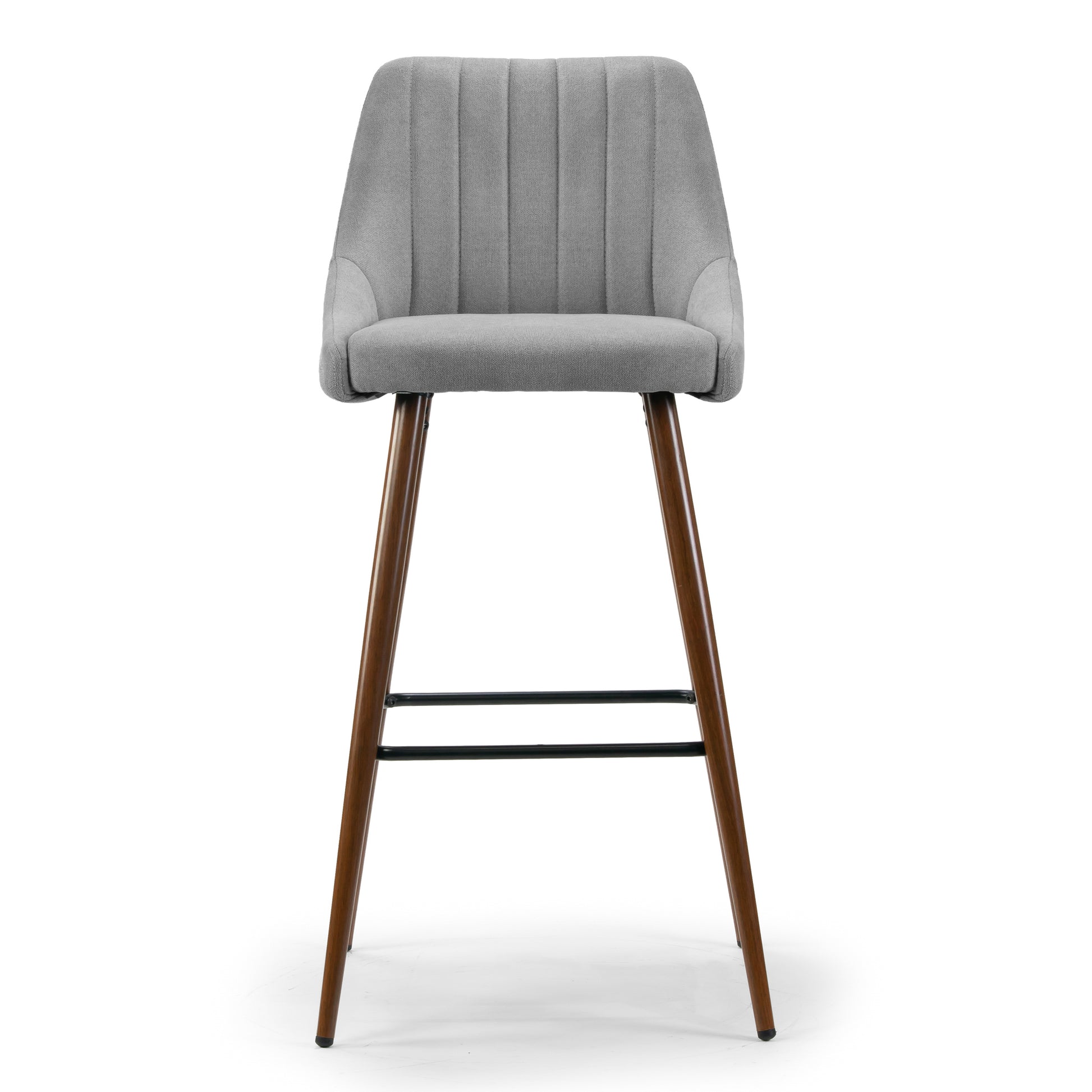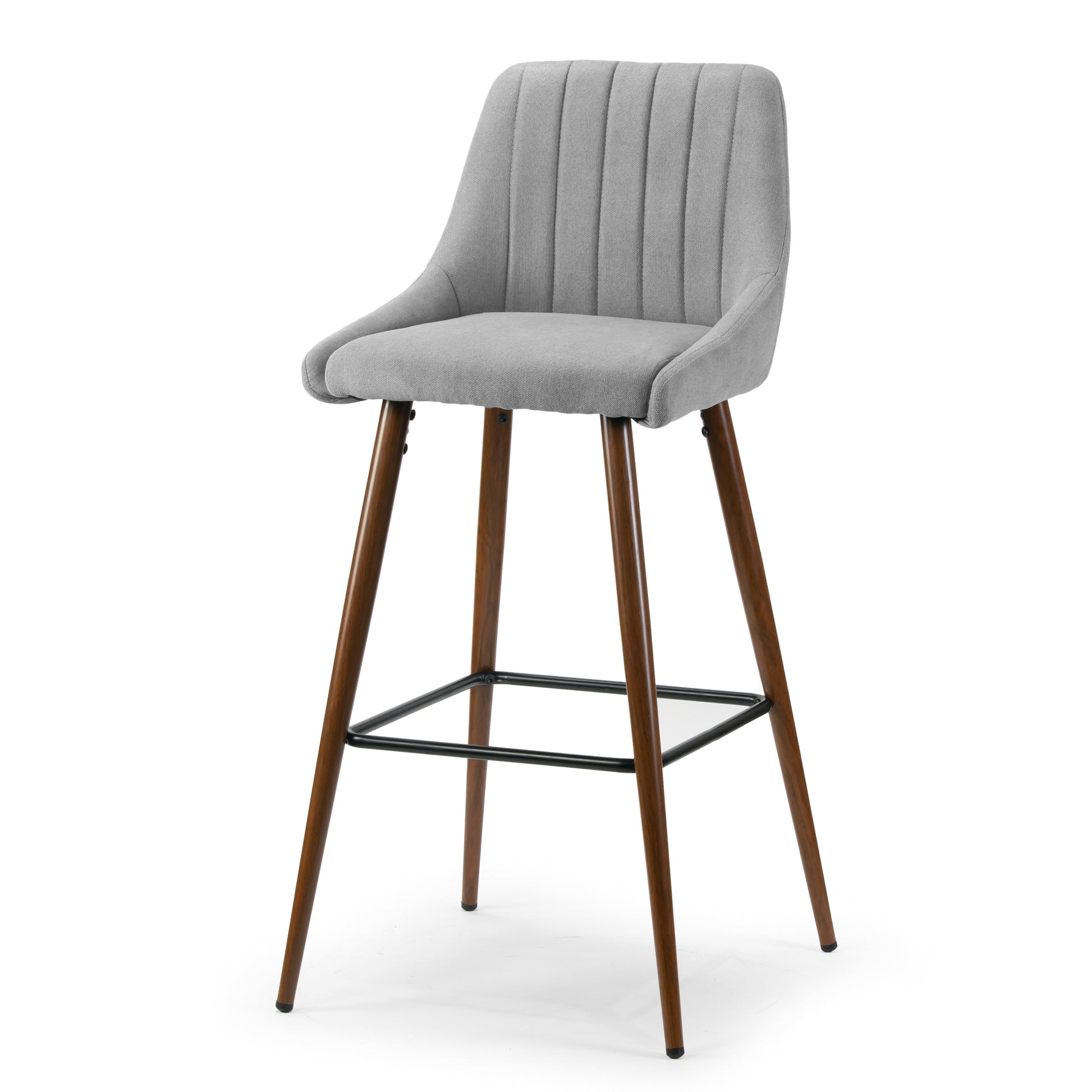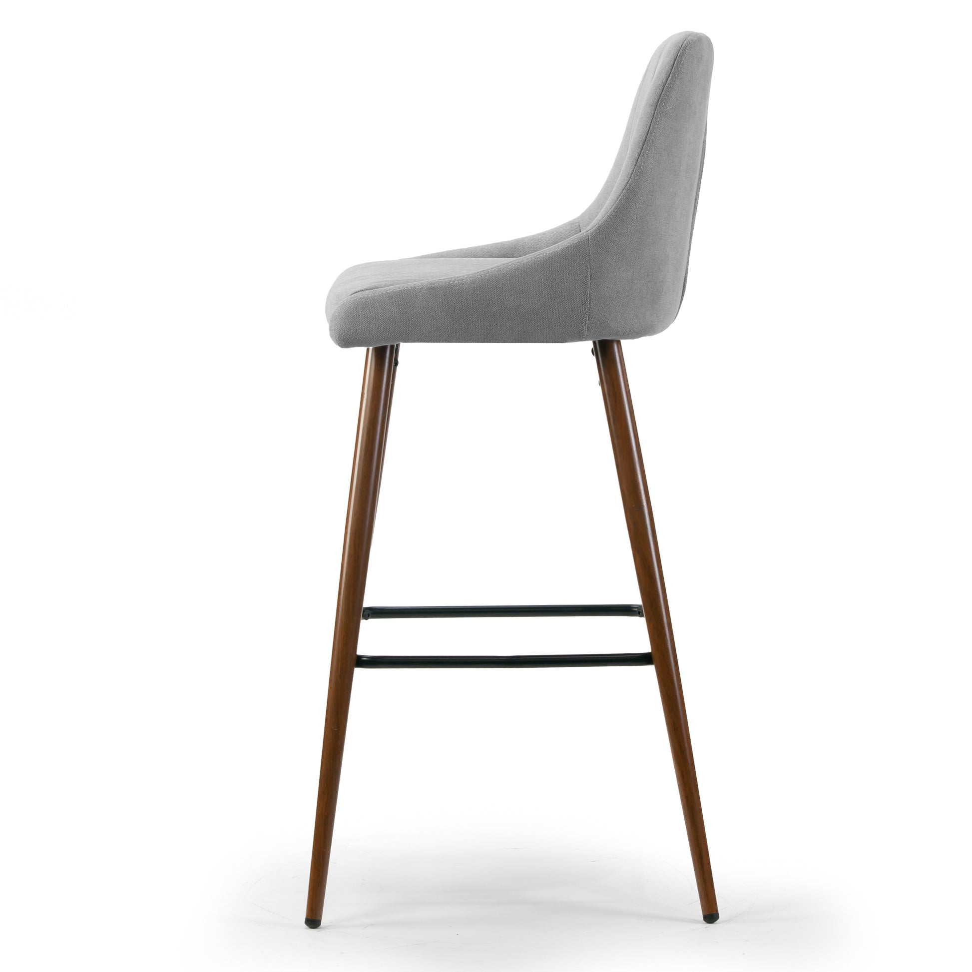 Light grey fabric upholstered barstool with brown wood grain finish metal legs and black metal footrest. Made with steel frame, footrest and legs, this bar stool is to last years. It also offers comfortable seating with high quality fabric upholstery and medium firmness foam cushion. Neutral color scheme matches every décor, while stitching accents on the back brings delicacy and subtlety. Assembly needed. Floor protectors attached to the bottom of the legs. Spot clean recommended.
