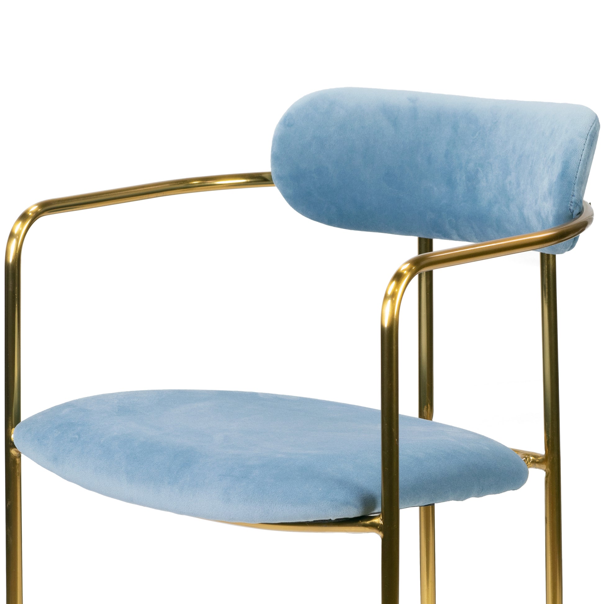 This light blue fabric dining chair will surely update your dining room with style. Upholstered with light blue velvety fabric, this chair is a statement of being modern and chic. Gold-tone finished metal legs and arms are sturdy and will provide seating comfort. Plastic stoppers are used for the legs to protector your floor. Minor assembly is needed. Spot clean recommended.