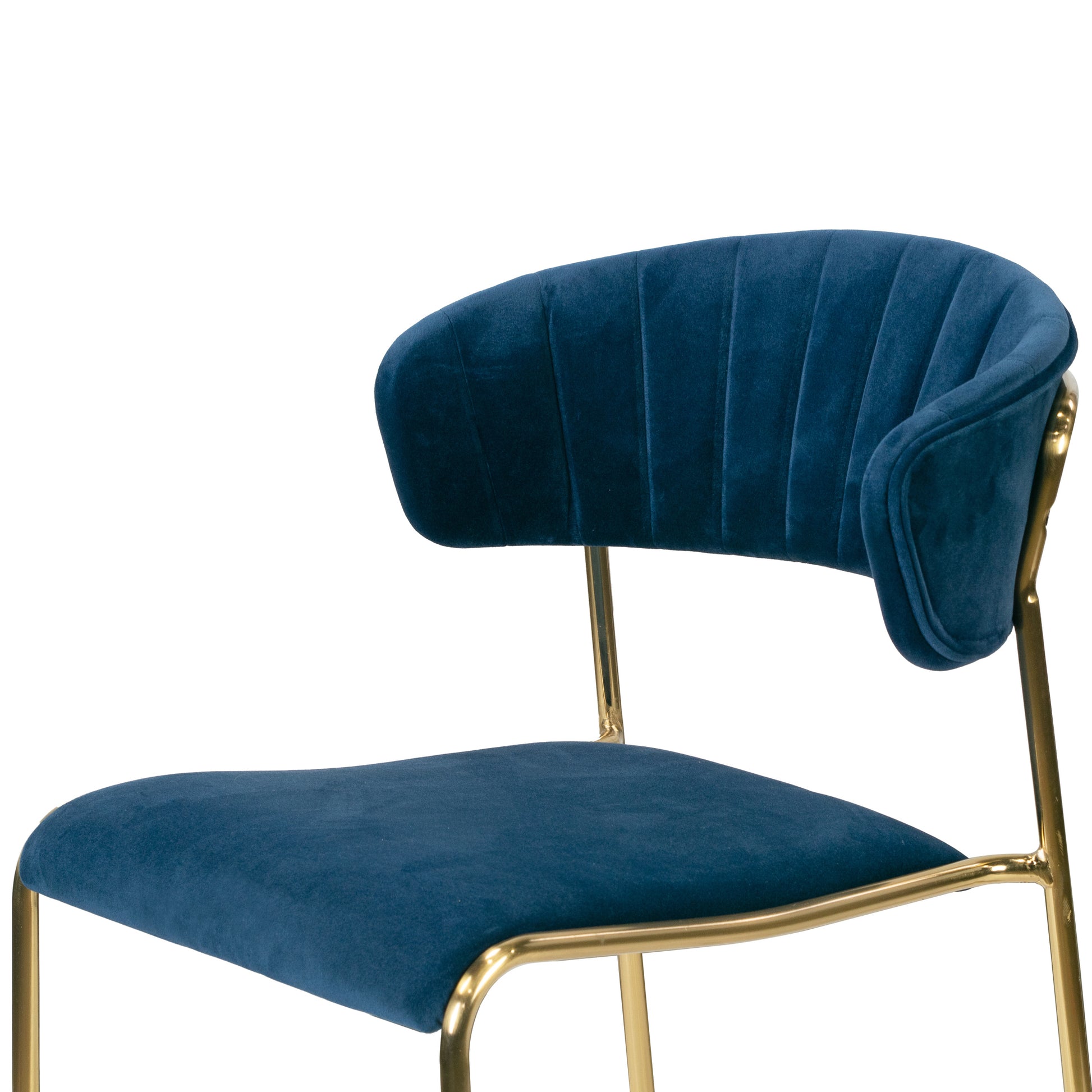 This blue fabric dining chair will surely update your dining room with style. Upholstered with blue velvety fabric, this chair is a statement of being bold, modern and chic. Decorative stitching on the back adds delicacy. Gold-tone finished metal frames are solid and sturdy. Plastic stoppers are used for the legs to protector your floor. Minor assembly is needed. Spot clean recommended.
